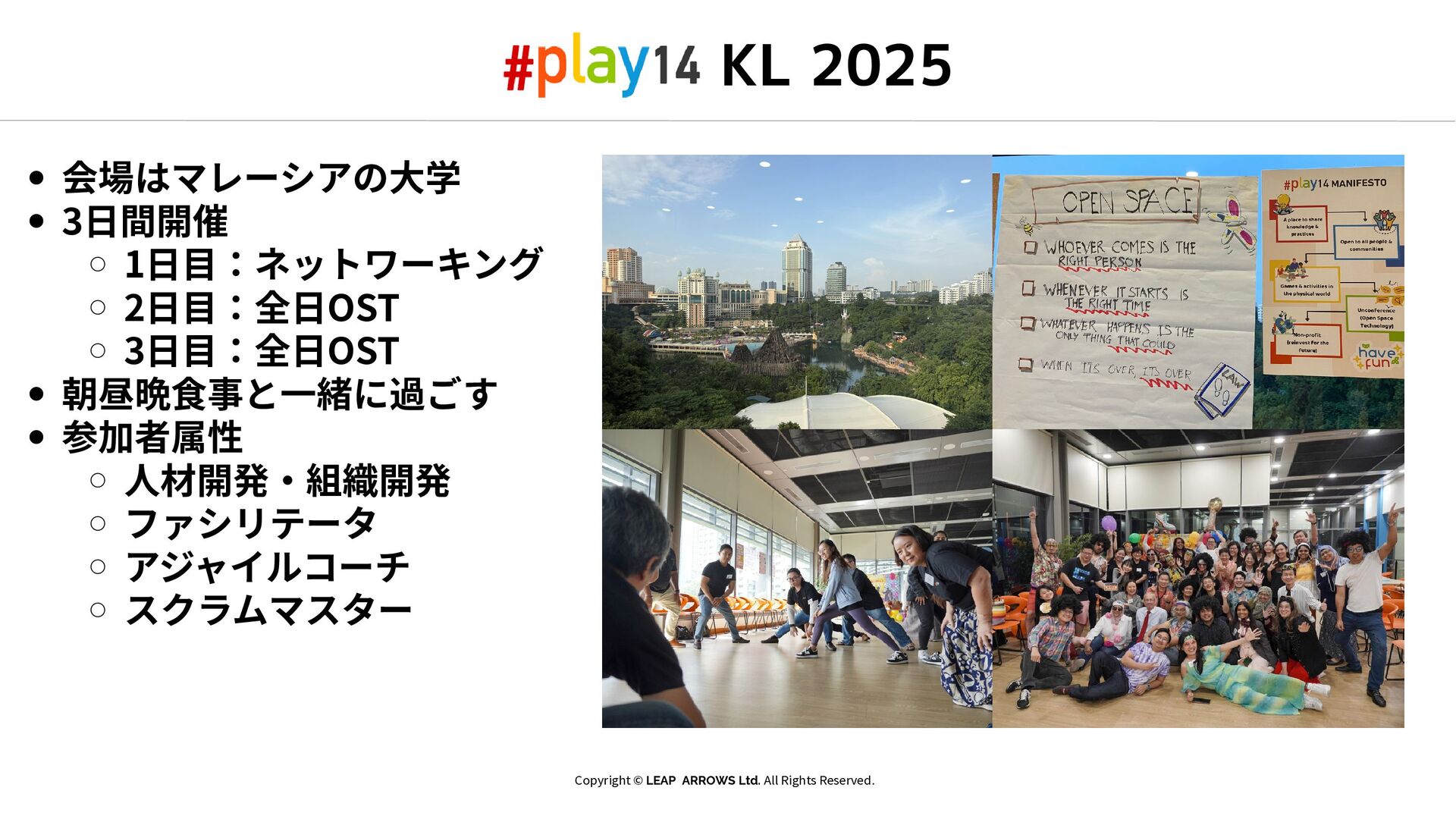 Copyright © All Rights Reserved. LEAP ARROWS Ltd. 会場はマレーシアの大学 3日間開催 1日目:ネットワーキング 2日目:全日OST 3日目:全日OST 朝昼晩食事と一緒に過ごす 参加者属性 人材開発・組織開発 ファシリテータ アジャイルコーチ スクラムマスター