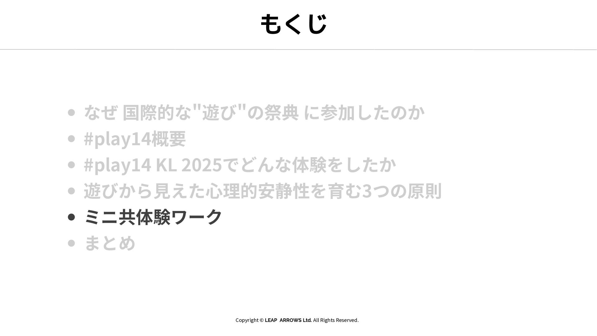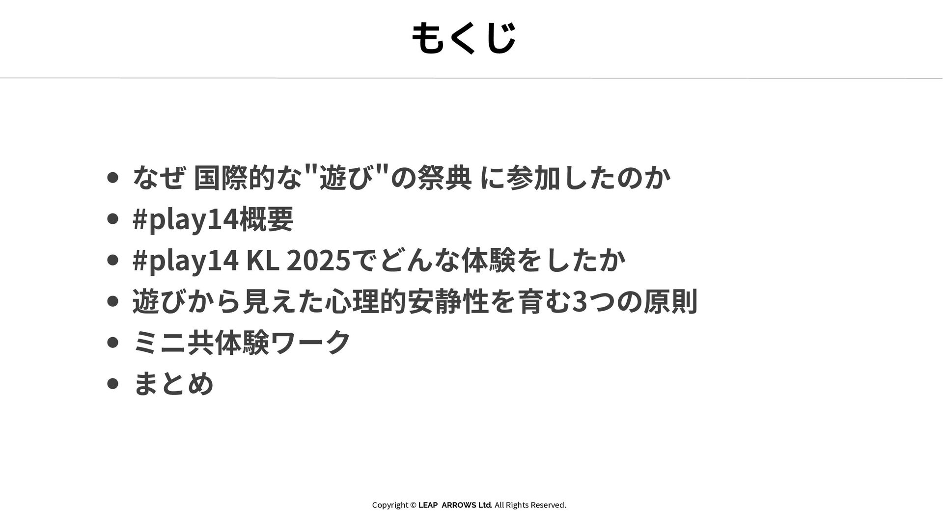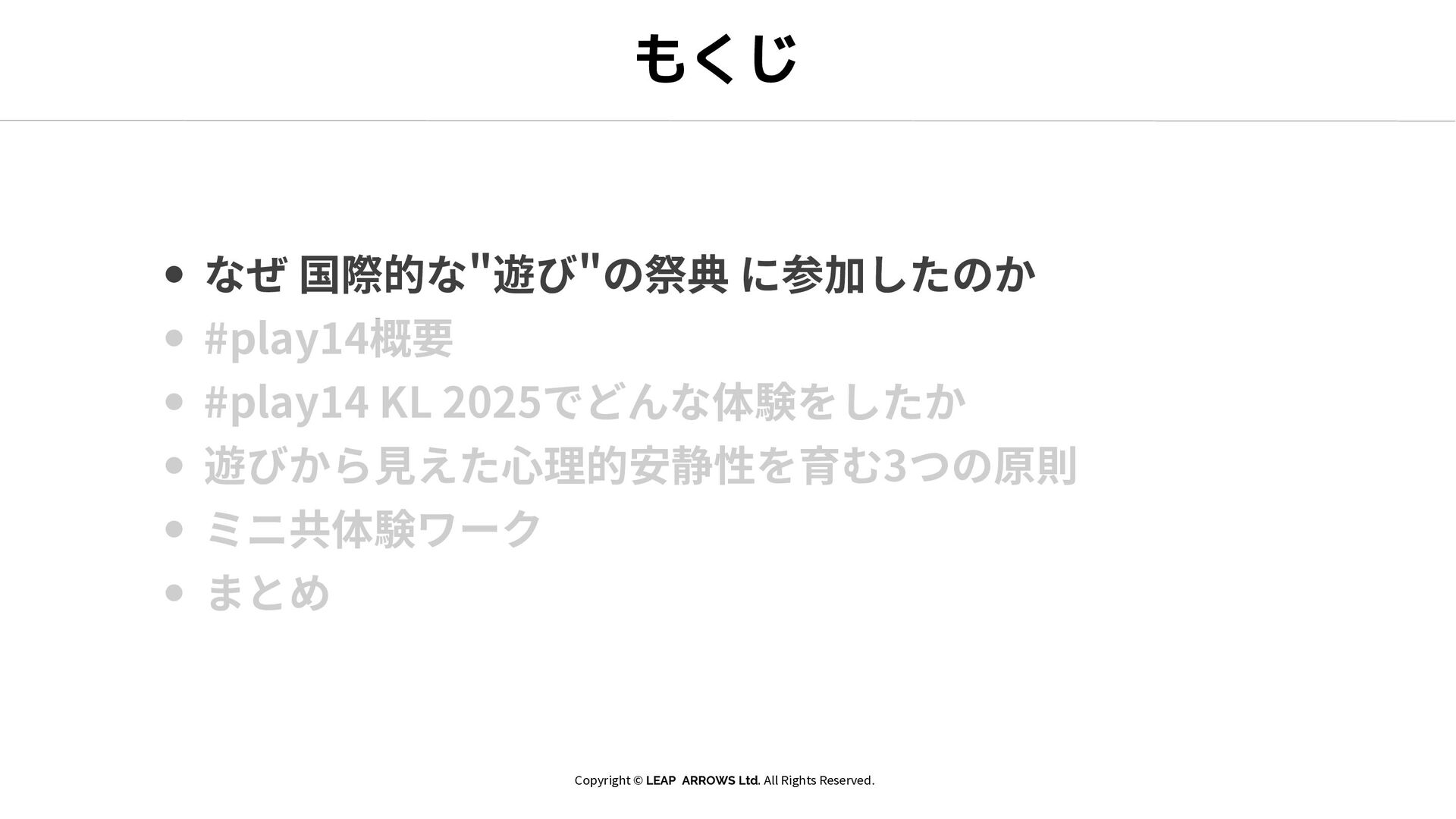 LEAP ARROWS Ltd. All Rights Reserved. Copyright © All Rights Reserved. LEAP ARROWS Ltd. ラーニングアウトカム 遊びが心理的安全性を高める仕組みを理解する 共体験が関係の質を変える瞬間を実感する 遊びデザインを現場に持ち帰るための原則を学ぶ