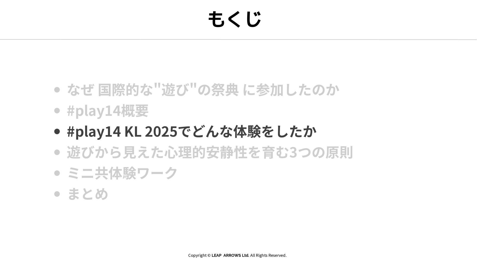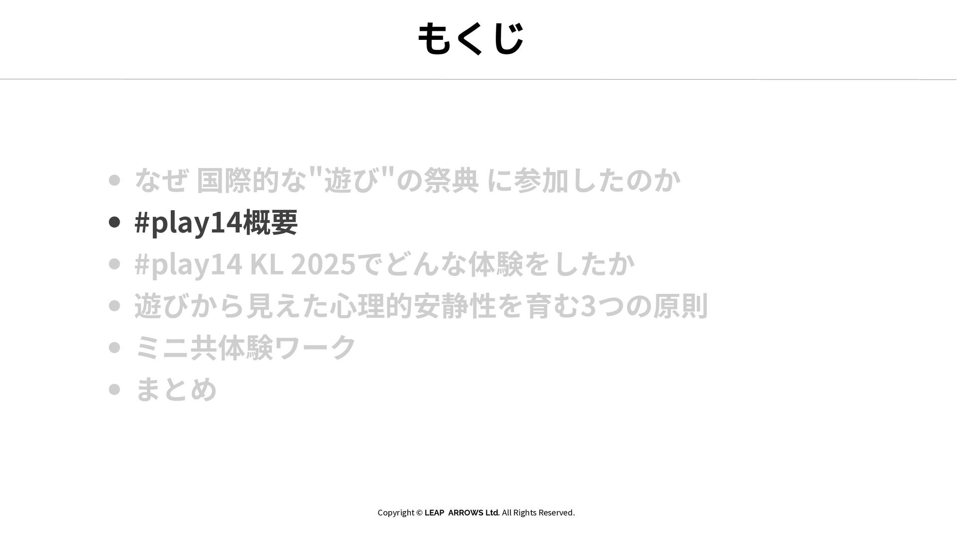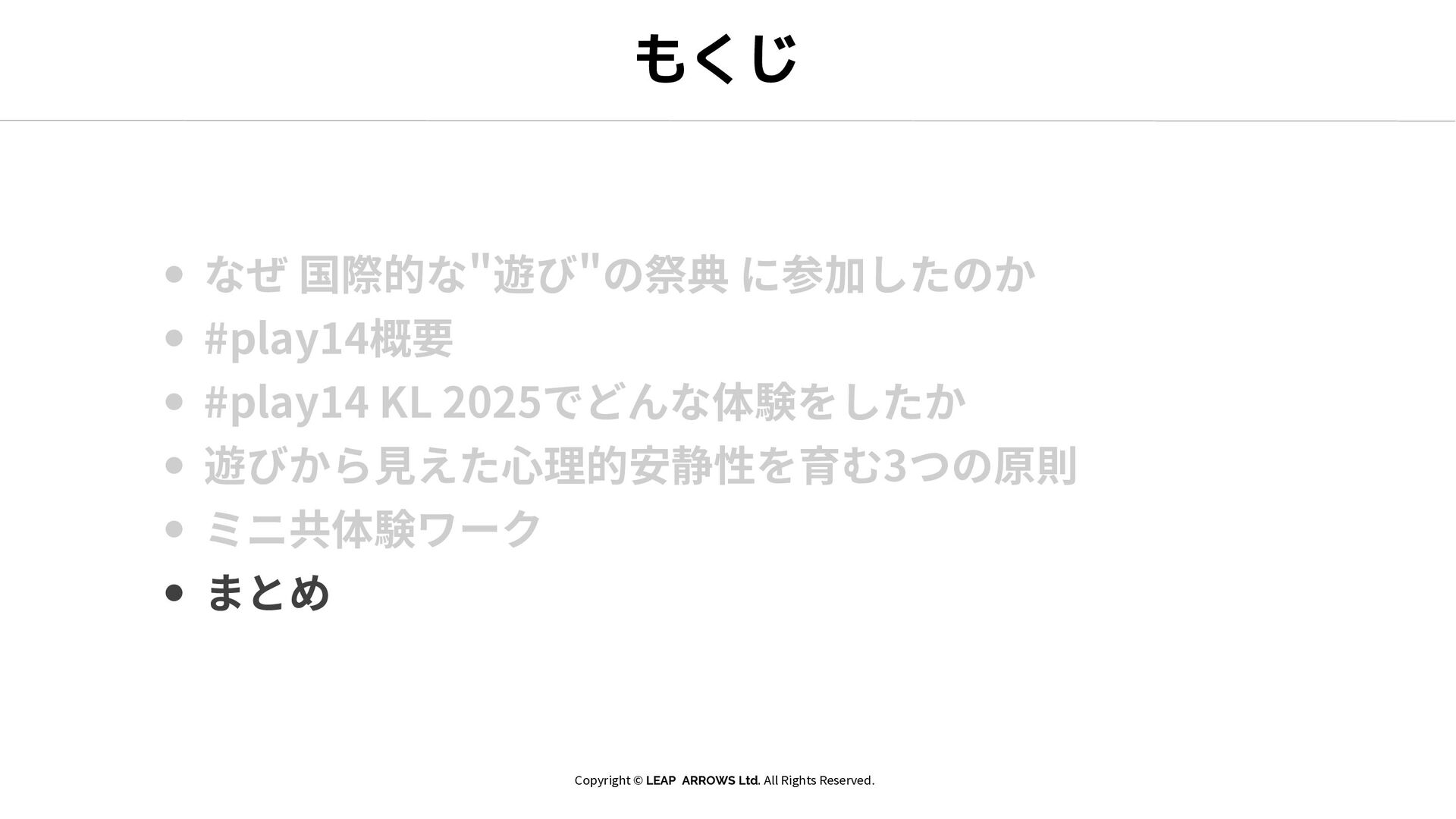 LEAP ARROWS Ltd. All Rights Reserved. Copyright © All Rights Reserved. LEAP ARROWS Ltd. ラーニングアウトカム 遊びが心理的安全性を高める仕組みを理解する 共体験が関係の質を変える瞬間を実感する 遊びデザインを現場に持ち帰るための原則を学ぶ