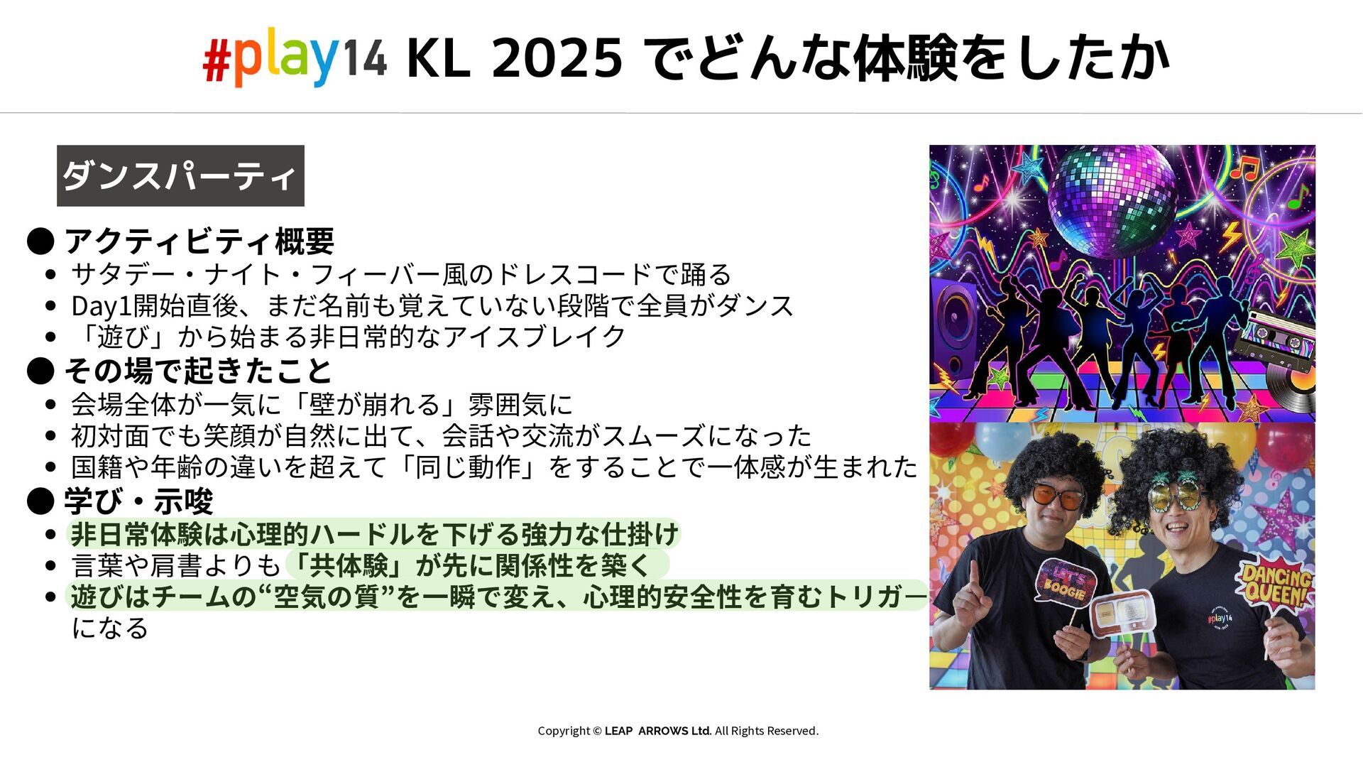 Reserved. Copyright © All Rights Reserved. LEAP ARROWS Ltd. • アクティビティ概要 サタデー・ナイト・フィーバー風のドレスコードで踊る Day1開始直後、まだ名前も覚えていない段階で全員がダンス 「遊び」から始まる非日常的なアイスブレイク • その場で起きたこと 会場全体が一気に「壁が崩れる」雰囲気に 初対面でも笑顔が自然に出て、会話や交流がスムーズになった 国籍や年齢の違いを超えて「同じ動作」をすることで一体感が生まれた • 学び・示唆 非日常体験は心理的ハードルを下げる強力な仕掛け 言葉や肩書よりも「共体験」が先に関係性を築く 遊びはチームの“空気の質”を一瞬で変え、心理的安全性を育むトリガー になる ダンスパーティ