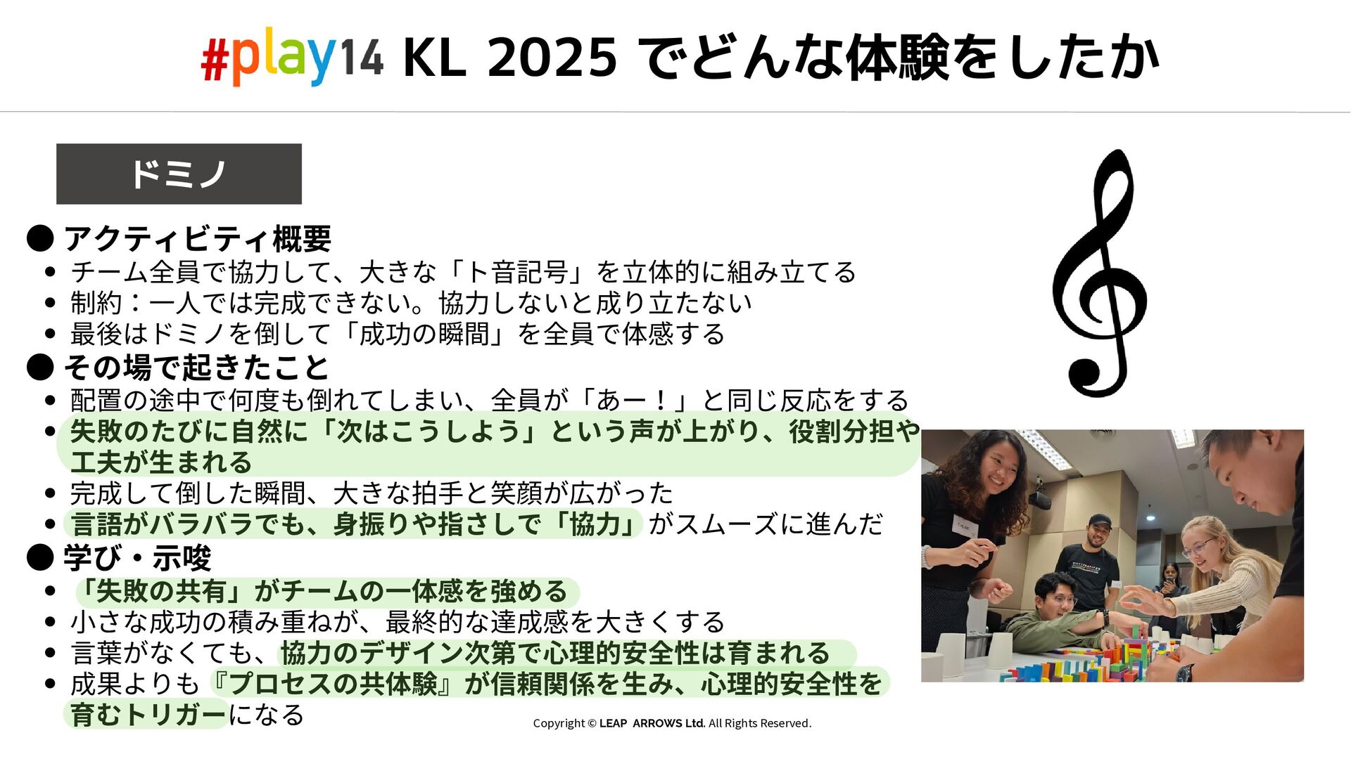 その場で起きたこと 配置の途中で何度も倒れてしまい、全員が「あー!」と同じ反応をする 失敗のたびに自然に「次はこうしよう」という声が上がり、役割分担や 工夫が生まれる 完成して倒した瞬間、大きな拍手と笑顔が広がった 言語がバラバラでも、身振りや指さしで「協力」がスムーズに進んだ • 学び・示唆 「失敗の共有」がチームの一体感を強める 小さな成功の積み重ねが、最終的な達成感を大きくする 言葉がなくても、協力のデザイン次第で心理的安全性は育まれる 成果よりも『プロセスの共体験』が信頼関係を生み、心理的安全性を 育むトリガーになる Copyright © LEAP ARROWS Ltd. All Rights Reserved. Copyright © All Rights Reserved. LEAP ARROWS Ltd.