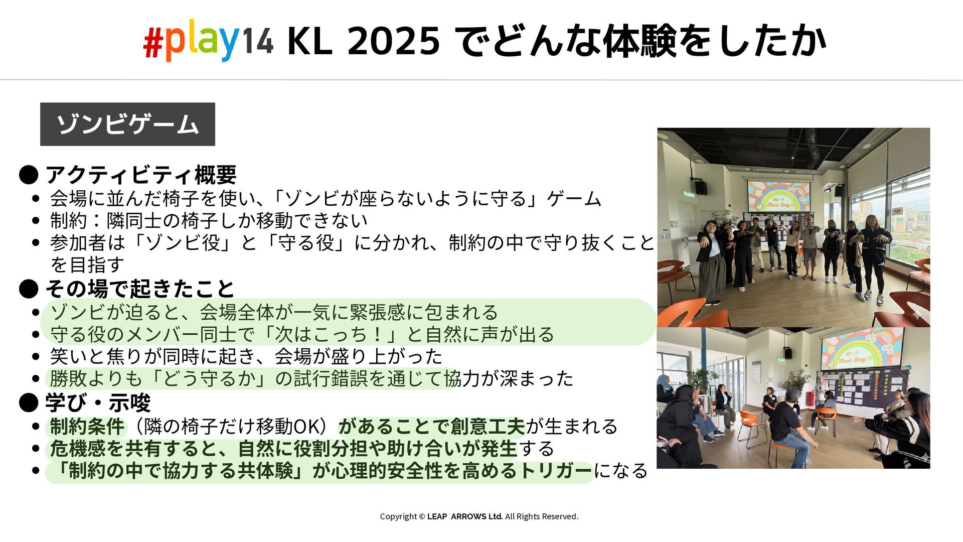 を目指す • その場で起きたこと ゾンビが迫ると、会場全体が一気に緊張感に包まれる 守る役のメンバー同士で「次はこっち!」と自然に声が出る 笑いと焦りが同時に起き、会場が盛り上がった 勝敗よりも「どう守るか」の試行錯誤を通じて協力が深まった • 学び・示唆 制約条件(隣の椅子だけ移動OK)があることで創意工夫が生まれる 危機感を共有すると、自然に役割分担や助け合いが発生する 「制約の中で協力する共体験」が心理的安全性を高めるトリガーになる Copyright © LEAP ARROWS Ltd. All Rights Reserved. Copyright © All Rights Reserved. LEAP ARROWS Ltd.
