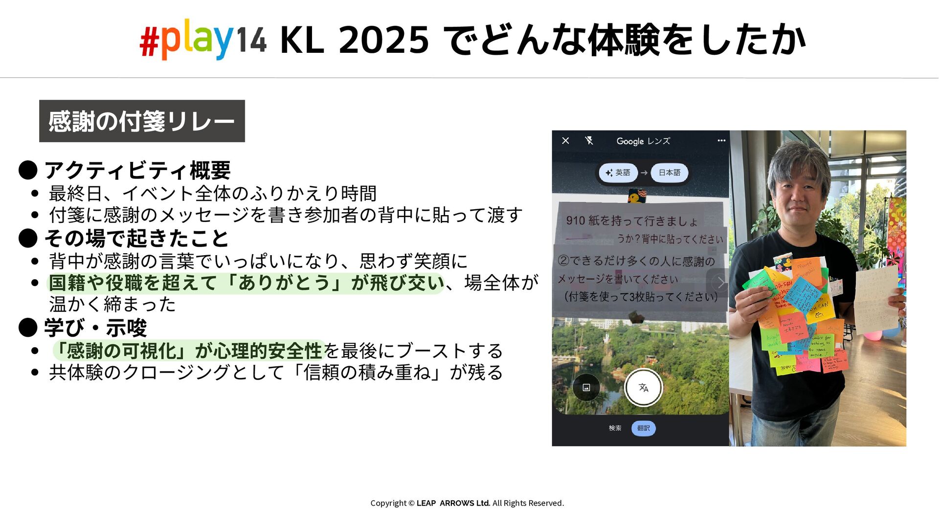 All Rights Reserved. LEAP ARROWS Ltd. 感謝の付箋リレー • アクティビティ概要 最終日、イベント全体のふりかえり時間 付箋に感謝のメッセージを書き参加者の背中に貼って渡す • その場で起きたこと 背中が感謝の言葉でいっぱいになり、思わず笑顔に 国籍や役職を超えて「ありがとう」が飛び交い、場全体が 温かく締まった • 学び・示唆 「感謝の可視化」が心理的安全性を最後にブーストする 共体験のクロージングとして「信頼の積み重ね」が残る KL 2025 でどんな体験をしたか