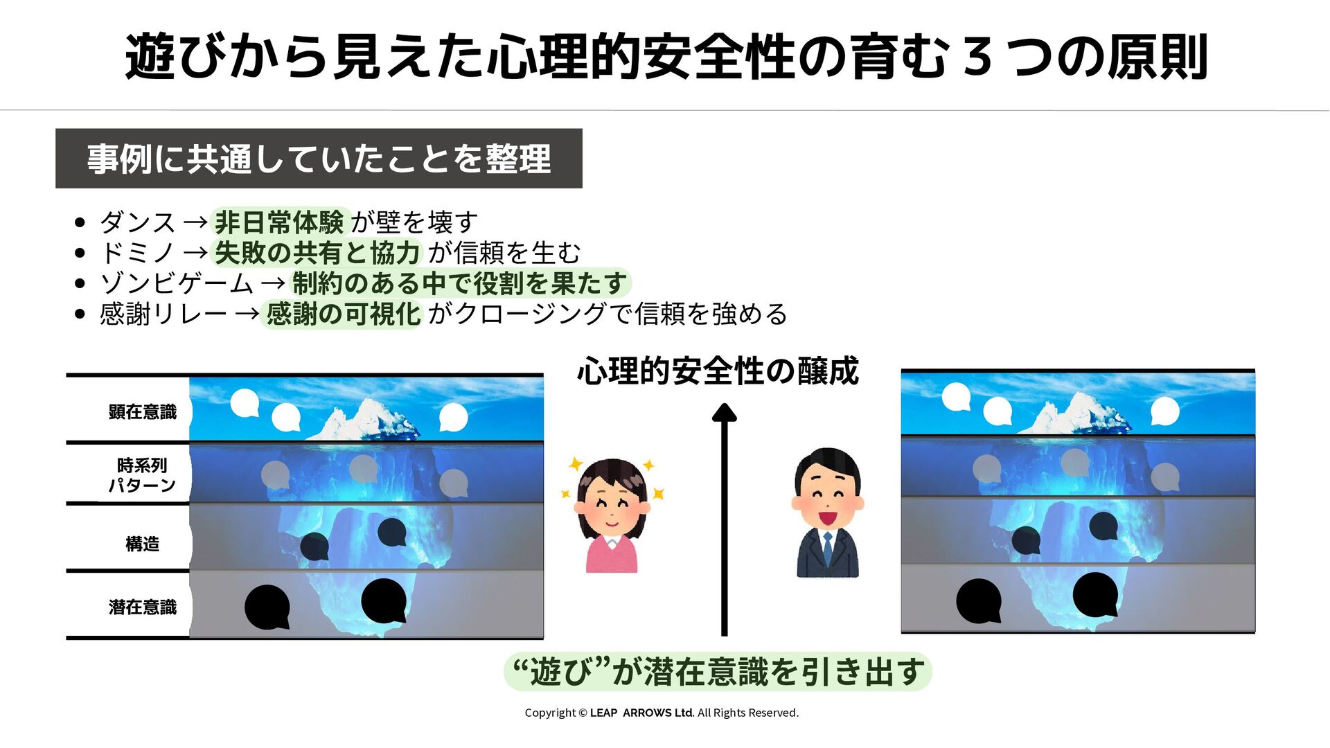 All Rights Reserved. LEAP ARROWS Ltd. 遊びから見えた心理的安全性の育む3つの原則 事例に共通していたことを整理 ダンス → 非日常体験 が壁を壊す ドミノ → 失敗の共有と協力 が信頼を生む ゾンビゲーム → 制約のある中で役割を果たす 感謝リレー → 感謝の可視化 がクロージングで信頼を強める 2 顕在意識 時系列 パターン 構造 潜在意識 2 心理的安全性の醸成 “遊び”が潜在意識を引き出す