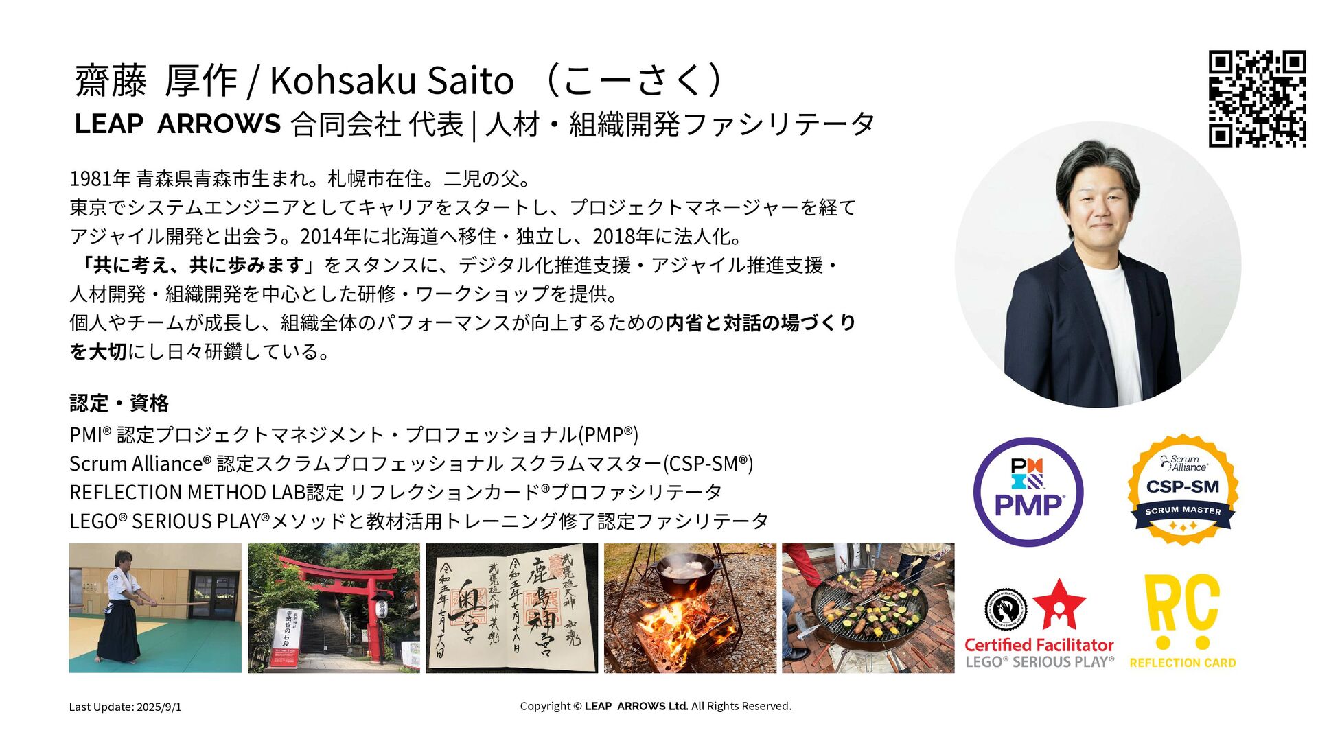 東京でシステムエンジニアとしてキャリアをスタートし、プロジェクトマネージャーを経て アジャイル開発と出会う。2014年に北海道へ移住・独立し、2018年に法人化。 「共に考え、共に歩みます」をスタンスに、デジタル化推進支援・アジャイル推進支援・ 人材開発・組織開発を中心とした研修・ワークショップを提供。 個人やチームが成長し、組織全体のパフォーマンスが向上するための内省と対話の場づくり を大切にし日々研鑽している。 PMI® 認定プロジェクトマネジメント・プロフェッショナル(PMP®) Scrum Alliance® 認定スクラムプロフェッショナル スクラムマスター(CSP-SM®) REFLECTION METHOD LAB認定 リフレクションカード®プロファシリテータ LEGO®︎ SERIOUS PLAY®︎メソッドと教材活用トレーニング修了認定ファシリテータ 認定・資格 Last Update: 2025/9/1 合同会社 代表 | 人材・組織開発ファシリテータ Copyright © All Rights Reserved. LEAP ARROWS Ltd.
