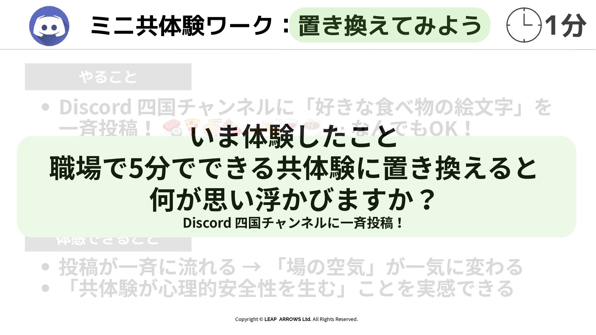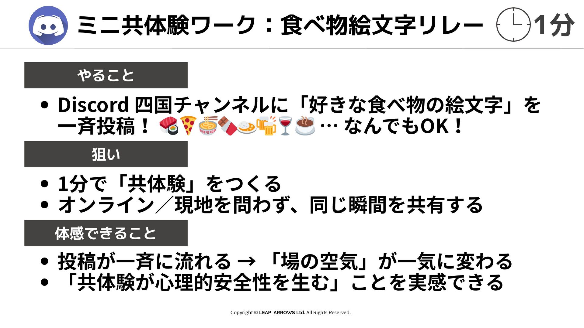 Reserved. Copyright © All Rights Reserved. LEAP ARROWS Ltd. ミニ共体験ワーク:置き換えてみよう Discord 四国チャンネルに「好きな食べ物の絵文字」を 一斉投稿! 🍣🍕🍜🍫🍛🍻🍷☕ … なんでもOK! 1分で「共体験」をつくる オンライン/現地を問わず、同じ瞬間を共有する 投稿が一斉に流れる → 「場の空気」が一気に変わる 「共体験が心理的安全性を生む」ことを実感できる 1分 いま体験したこと 職場で5分でできる共体験に置き換えると 何が思い浮かびますか? Discord 四国チャンネルに一斉投稿!