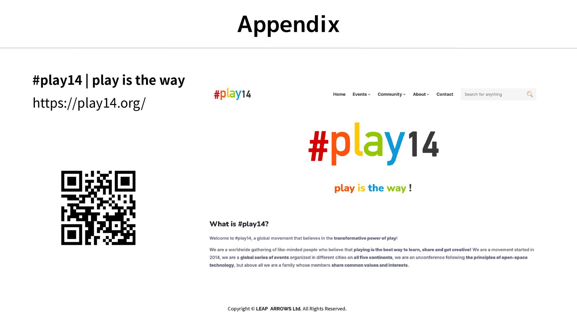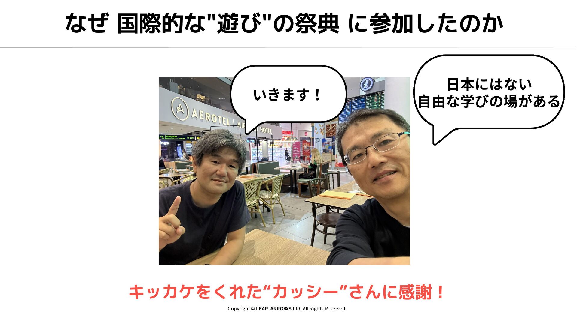 キッカケをくれた“カッシー”さんに感謝! 日本にはない 自由な学びの場がある なぜ 国際的な"遊び"の祭典 に参加したのか Copyright © LEAP ARROWS