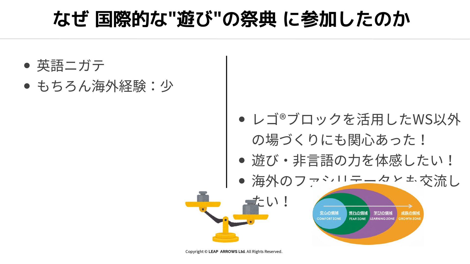 レゴ®ブロックを活用したWS以外 の場づくりにも関心あった! 遊び・非言語の力を体感したい! 海外のファシリテータとも交流し たい! 英語ニガテ もちろん海外経験:少 なぜ 国際的な"遊び"の祭典 に参加したのか