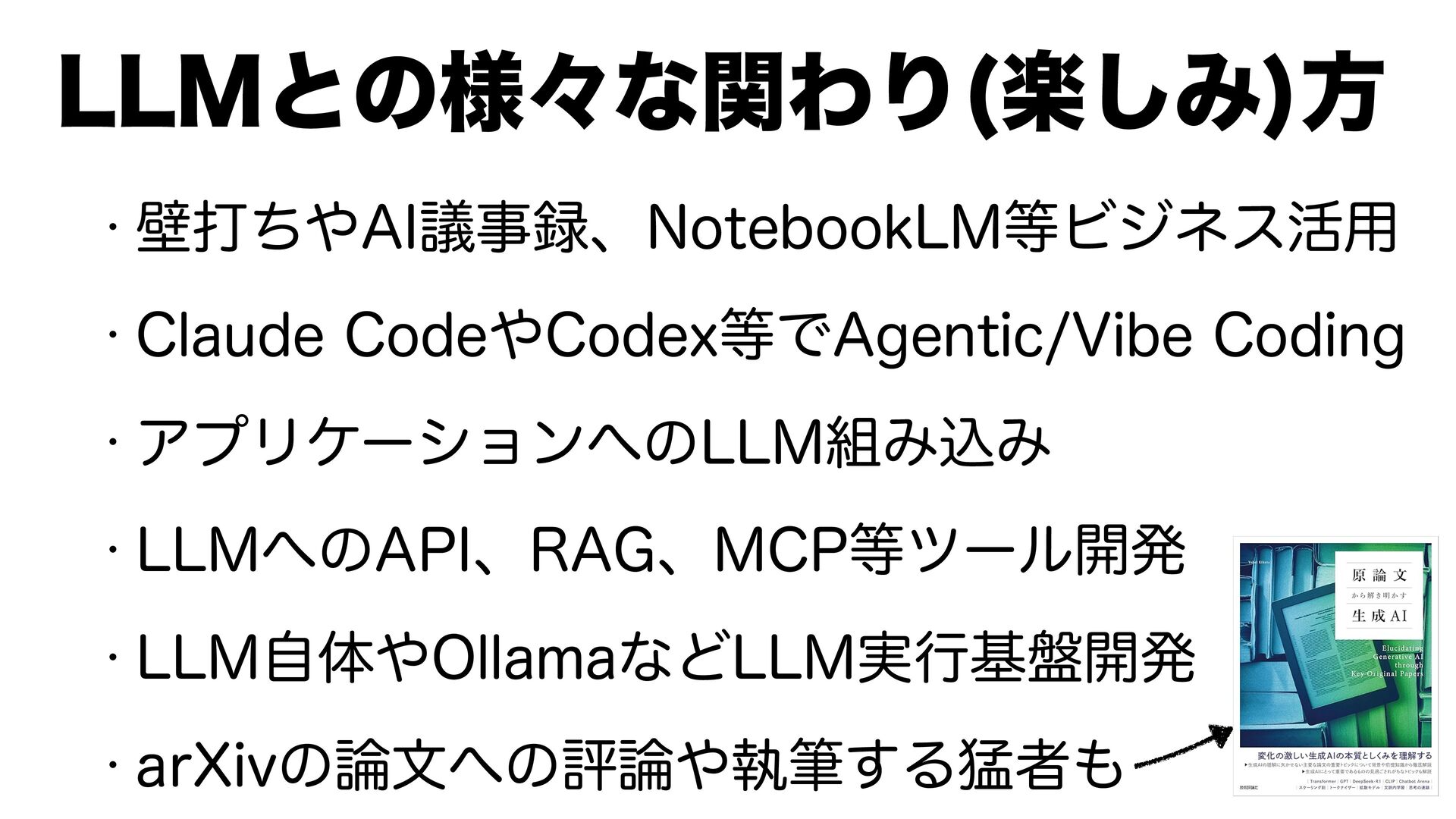 w นଧͪ"*ٞࣄɺ/PUFCPPL-.Ϗδωε׆༻ w $MBVEF$PEF$PEFYͰ"HFOUJD7JCF$PEJOH w ΞϓϦέʔγϣϯͷ--.ΈࠐΈ w --.ͷ"1*ɺ3"(ɺ.$1πʔϧ։ൃ w --.ࣗମ0MMBNBͳͲ--.࣮ߦج൫։ൃ