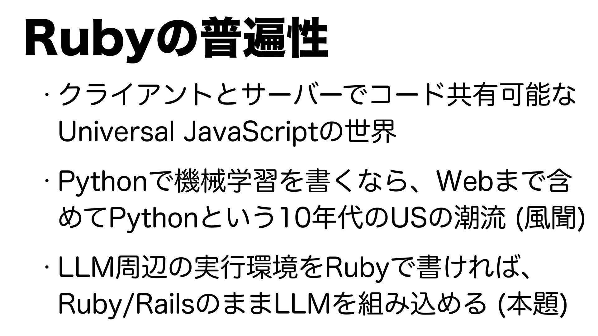w ΫϥΠΞϯτͱαʔόʔͰίʔυڞ༗Մೳͳ 6OJWFSTBM+BWB4DSJQUͷੈք w 1ZUIPOͰػցֶशΛॻ͘ͳΒɺ8FC·Ͱؚ Ίͯ1ZUIPOͱ͍͏ͷ64ͷைྲྀ ෩ฉ w --.पลͷ࣮ߦڥΛ3VCZͰॻ͚Εɺ