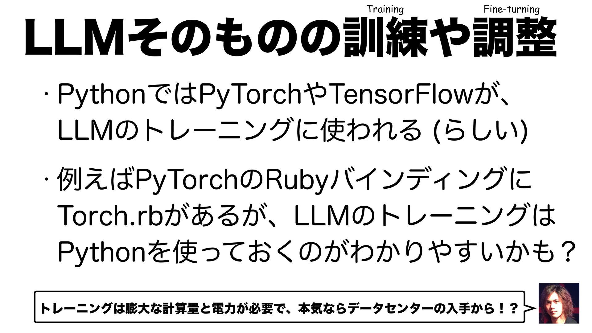 w 1ZUIPOͰ1Z5PSDI5FOTPS'MPX͕ɺ --.ͷτϨʔχϯάʹΘΕΔ Β͍͠ w ྫ͑1Z5PSDIͷ3VCZόΠϯσΟϯάʹ 5PSDISC͕͋Δ͕ɺ--.ͷτϨʔχϯά 1ZUIPOΛ͓ͬͯ͘ͷ͕Θ͔Γ͍͔͢ʁ --.ͦͷͷͷ܇࿅ௐ