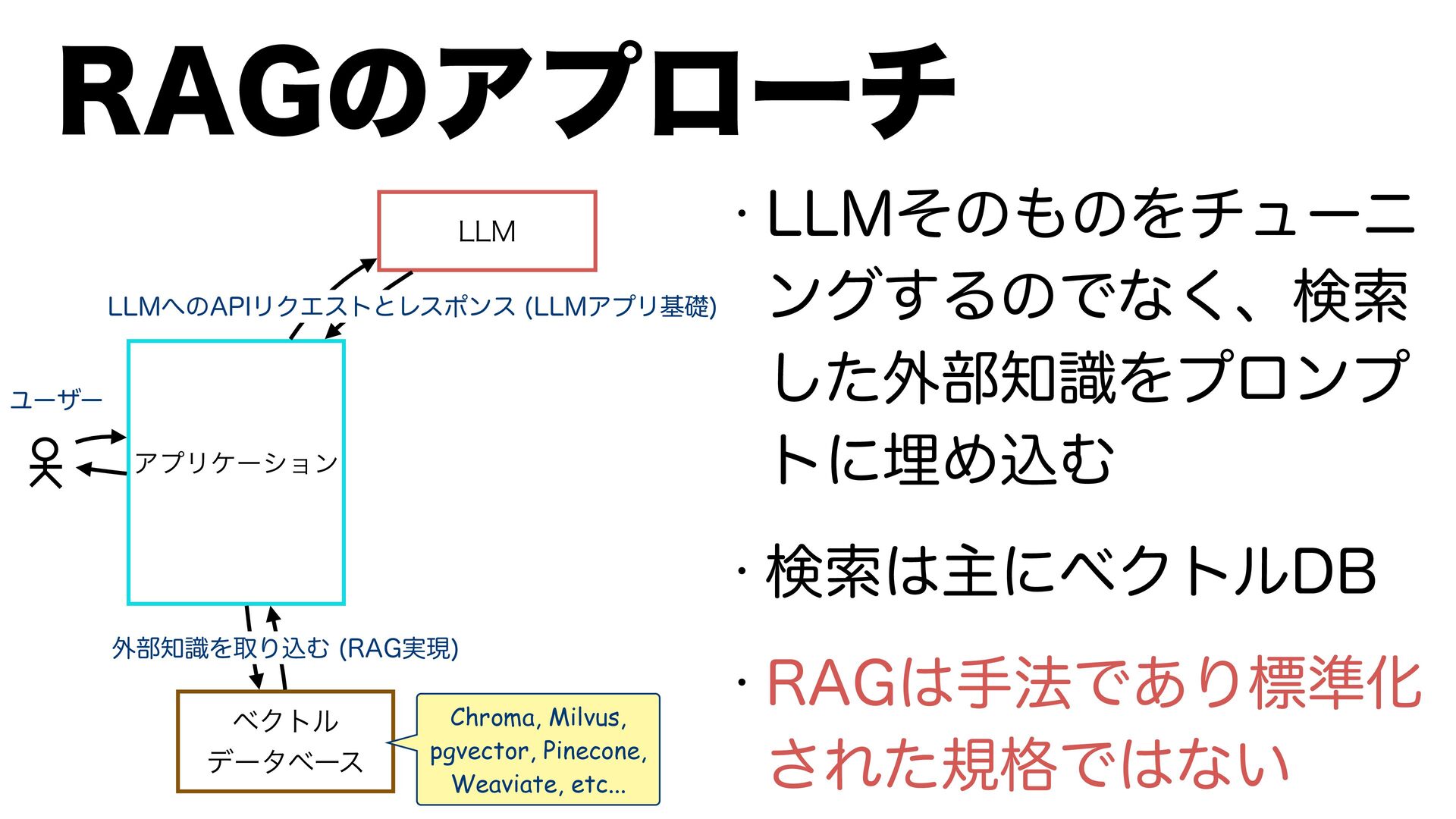 3"(ख๏Ͱ͋Γඪ४Խ ͞Εͨن֨Ͱͳ͍ --. --.ͷ"1*ϦΫΤετͱϨεϙϯε --.ΞϓϦجૅ ϕΫτϧ σʔλϕʔε Ϣʔβʔ Chroma, Milvus, pgvector, Pinecone, Weaviate, etc... ֎෦ࣝΛऔΓࠐΉ 3"(࣮ݱ