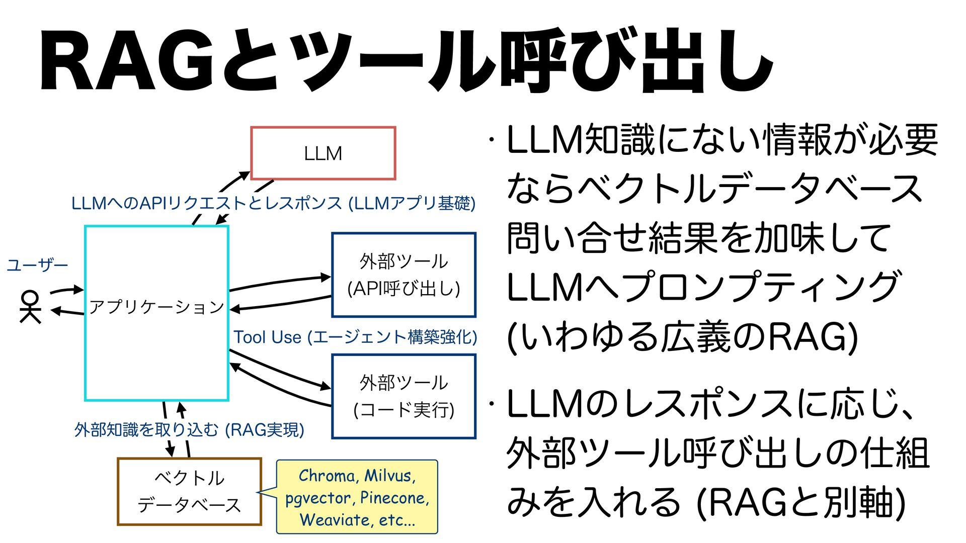 --.ϓϩϯϓςΟϯά ͍ΘΏΔٛͷ3"( w --.ͷϨεϙϯεʹԠ͡ɺ ֎෦πʔϧݺͼग़͠ͷ ΈΛೖΕΔ 3"(ͱผ࣠ --. --.ͷ"1*ϦΫΤετͱϨεϙϯε --.ΞϓϦجૅ ϕΫτϧ σʔλϕʔε ֎෦πʔϧ ίʔυ࣮ߦ Ϣʔβʔ Chroma, Milvus, pgvector, Pinecone, Weaviate, etc... ֎෦ࣝΛऔΓࠐΉ 3"(࣮ݱ