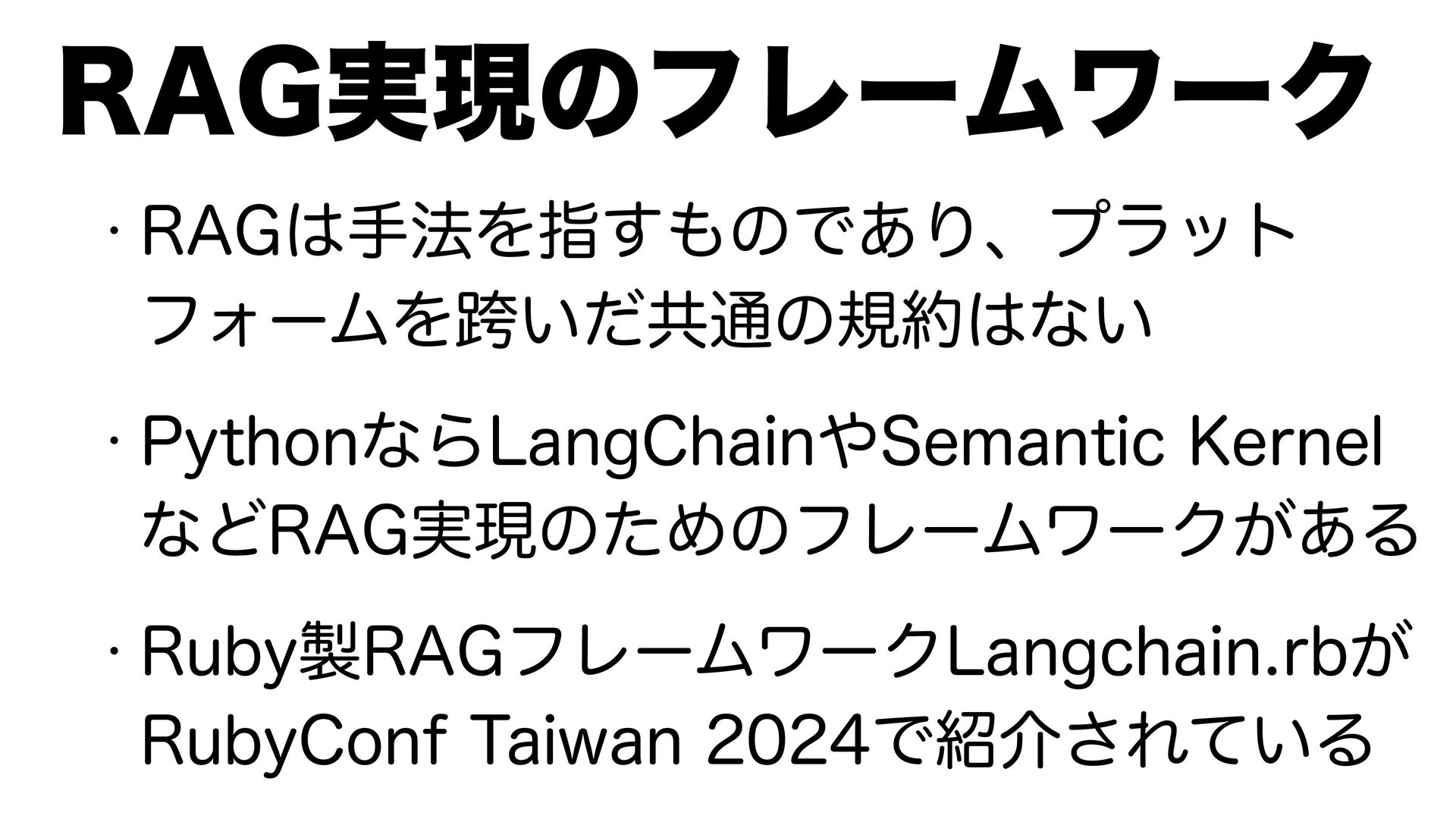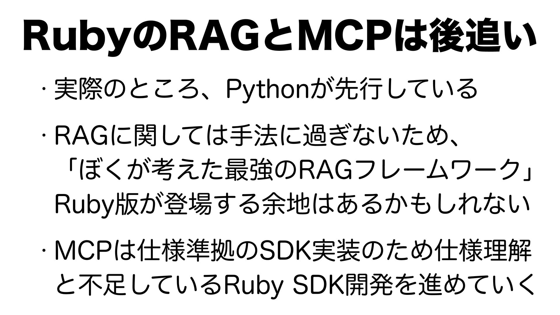 w ࣮ࡍͷͱ͜Ζɺ1ZUIPO͕ઌߦ͍ͯ͠Δ w 3"(ʹؔͯ͠ख๏ʹա͗ͳ͍ͨΊɺ ʮ΅͕͘ߟ͑ͨ࠷ڧͷ3"(ϑϨʔϜϫʔΫʯ 3VCZ൛͕ొ͢Δ༨͋Δ͔͠Εͳ͍ w .$1༷४ڌͷ4%,࣮ͷͨΊ༷ཧղ ͱෆ͍ͯ͠Δ3VCZ4%,։ൃΛਐΊ͍ͯ͘ 3VCZͷ3"(ͱ.$1ޙ͍