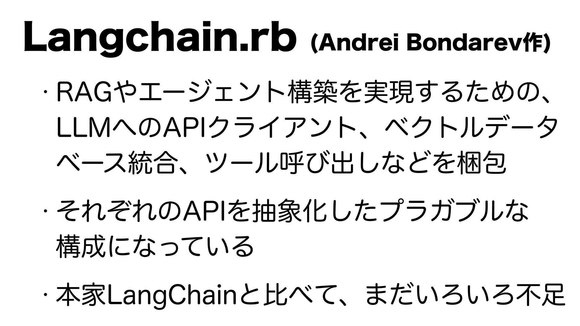 w -BOHDIBJOSCɺ--.ΛғΉ3VCZͷϥΠϒ ϥϦϛυϧΣΞΛΔ͖͔͚ͬʹͳΔ w 1ZUIPOͷ-BOH$IBJOʹ͋ΔػೳΛ3VCZͷ -BOHDIBJOSCʹҠ২Ͱ͖ͦ͏ w -BOHDIBJOSCͷίϯτϦϏϡʔγϣϯͷ ϙΠϯτͱͯ͠5PPM֦ॆɺ-$&-αϙʔτ -BOHDIBJOSCʹΑΔ3"(·ͱΊ