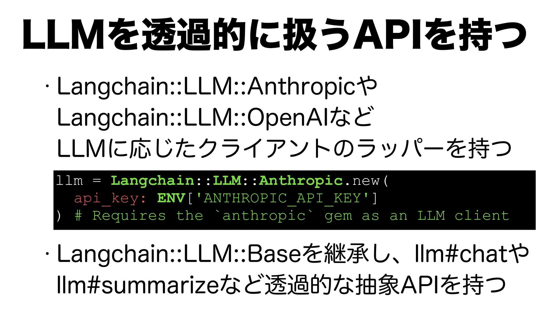 w -BOHDIBJO--."OUISPQJD -BOHDIBJO--.0QFO"*ͳͲ --.ʹԠͨ͡ΫϥΠΞϯτͷϥούʔΛ࣋ͭ w -BOHDIBJO--.#BTFΛܧঝ͠ɺMMNDIBU MMNTVNNBSJ[FͳͲಁաతͳந"1*Λ࣋ͭ --.Λಁաతʹѻ͏"1*Λ࣋ͭ llm