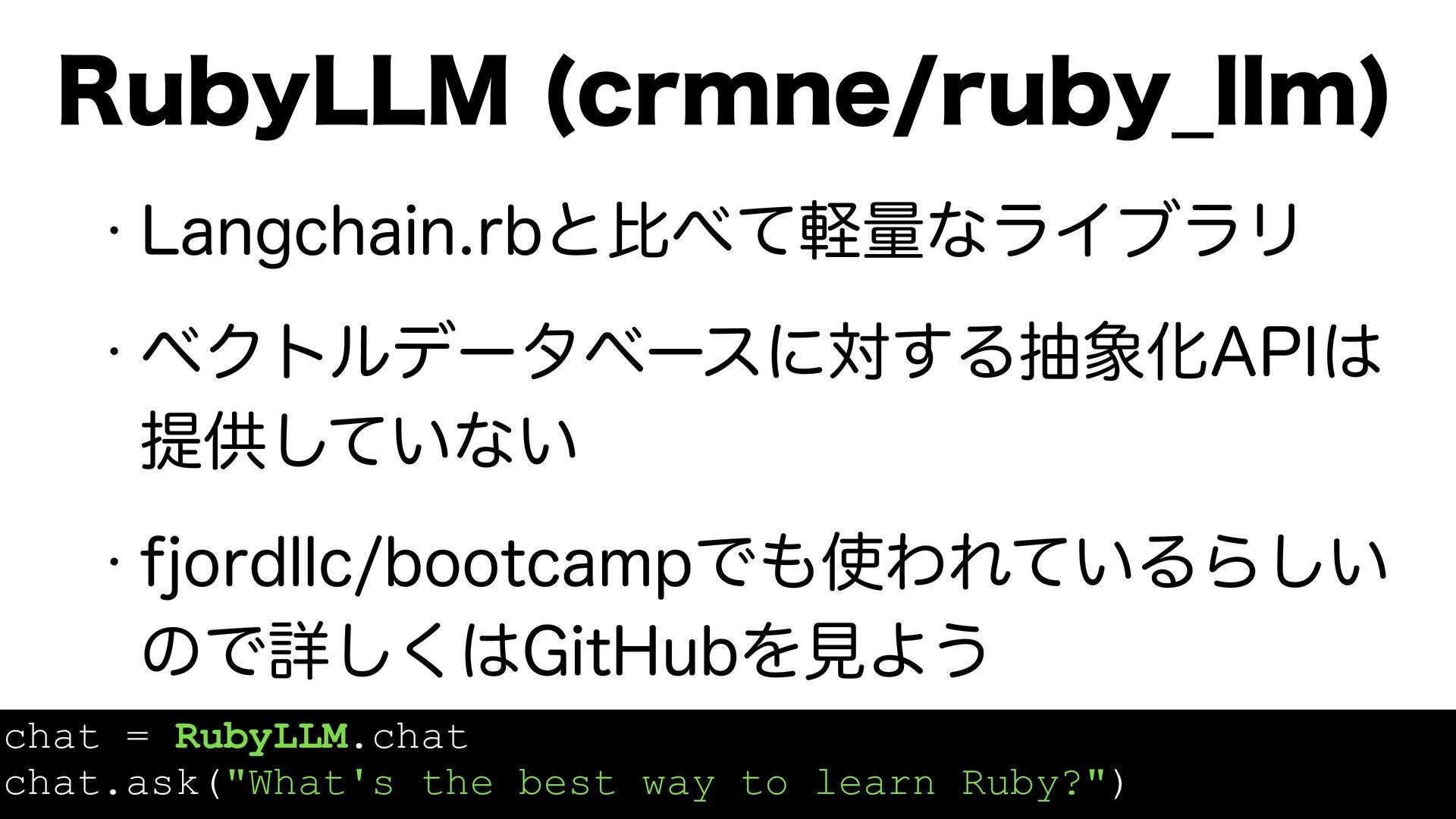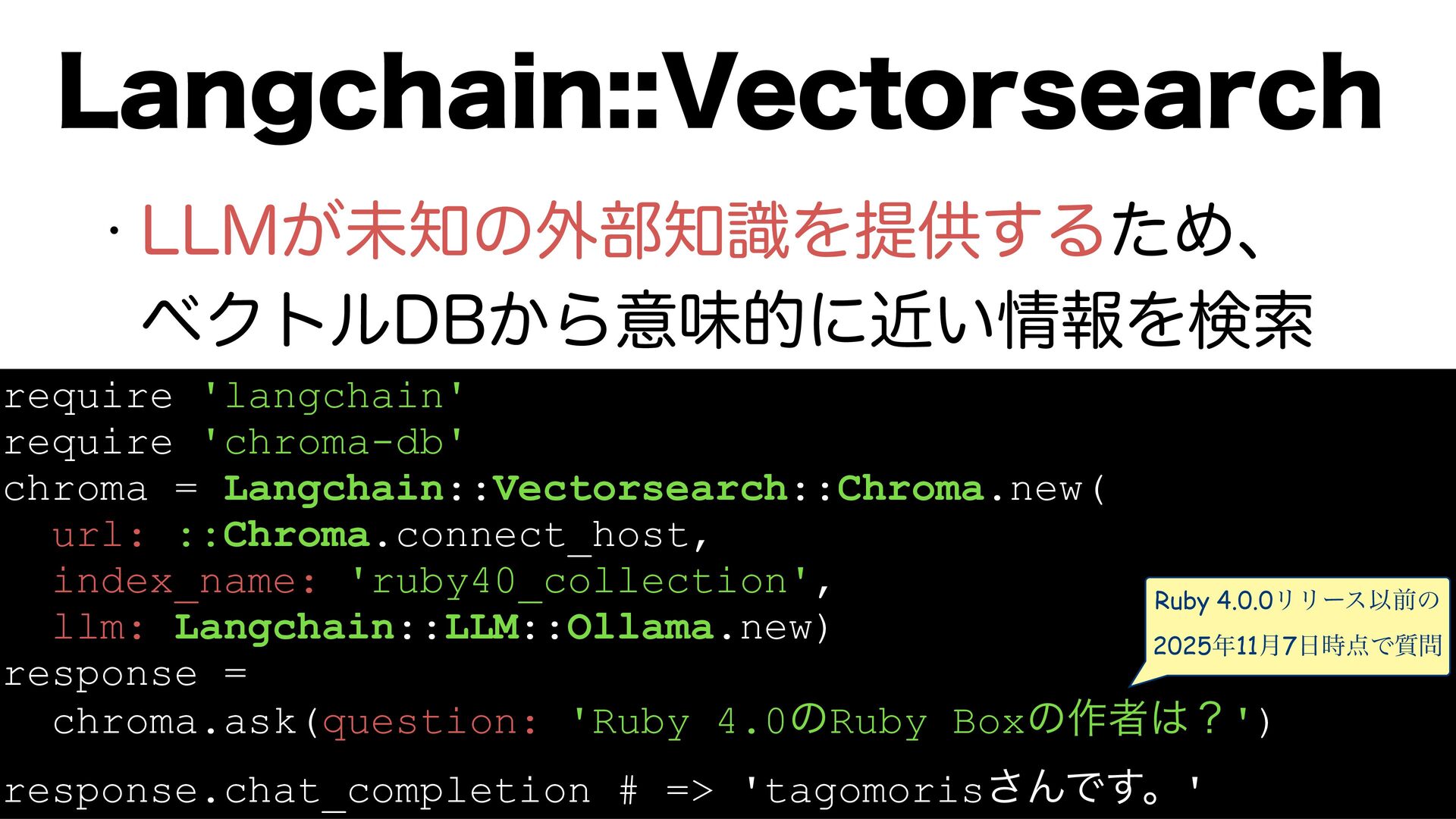 index_name: 'ruby40_collection', llm: Langchain::LLM::Ollama.new) response = chroma.ask(question: 'Ruby 4.0ͷRuby Boxͷ࡞ऀʁ') response.chat_completion # => 'tagomoris͞ΜͰ͢ɻ' w --.͕ະͷ֎෦ࣝΛఏڙ͢ΔͨΊɺ ϕΫτϧ%#͔Βҙຯతʹ͍ۙใΛݕࡧ Ruby 4.0.0ϦϦʔεҎલͷ 202511݄7࣌Ͱ࣭