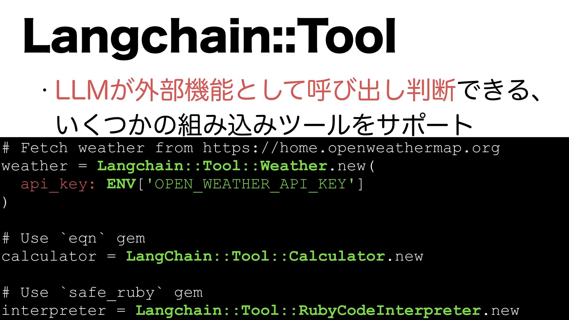 weather = Langchain::Tool::Weather.new( api_key: ENV['OPEN_WEATHER_API_KEY'] ) # Use `eqn` gem calculator = LangChain::Tool::Calculator.new # Use `safe_ruby` gem interpreter = Langchain::Tool::RubyCodeInterpreter.new