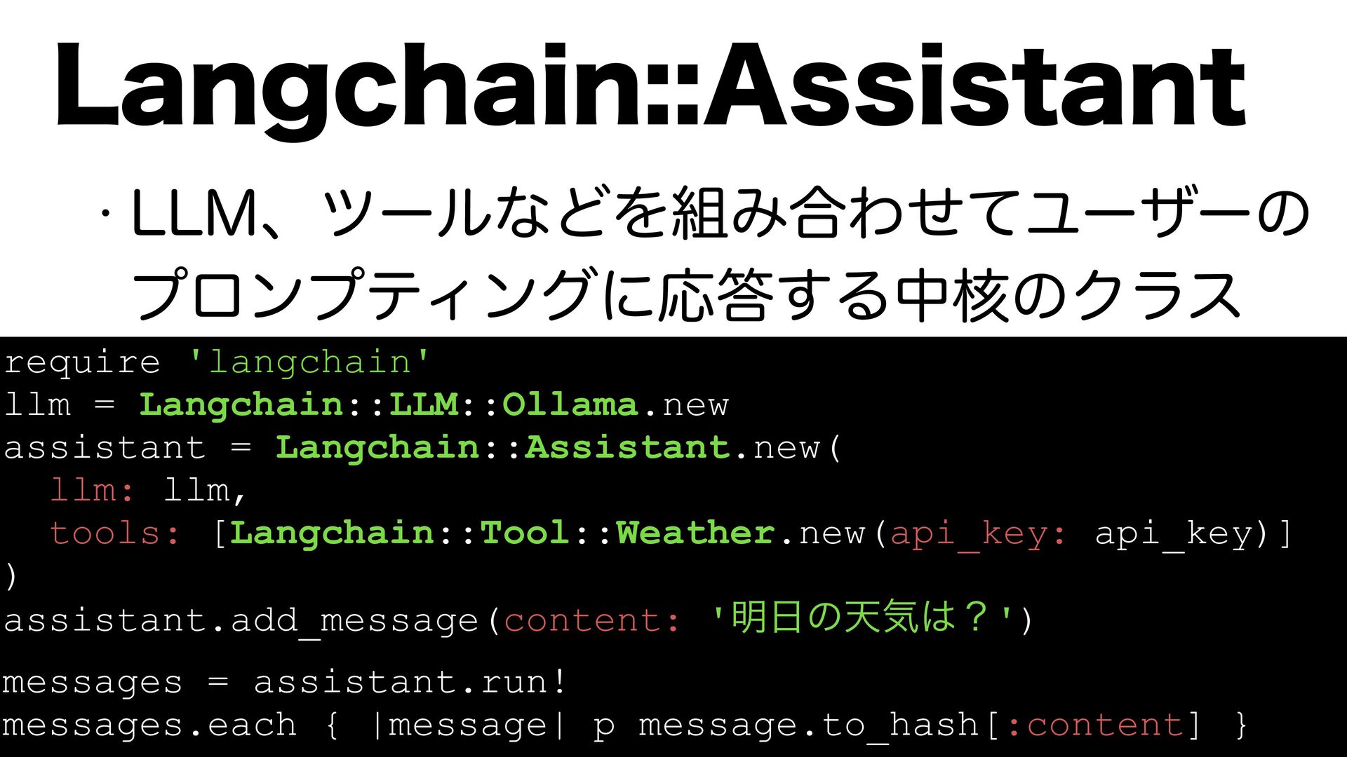 w --.ɺπʔϧͳͲΛΈ߹ΘͤͯϢʔβʔͷ ϓϩϯϓςΟϯάʹԠ͢Δத֩ͷΫϥε -BOHDIBJO"TTJTUBOU require 'langchain' llm = Langchain::LLM::Ollama.new assistant
