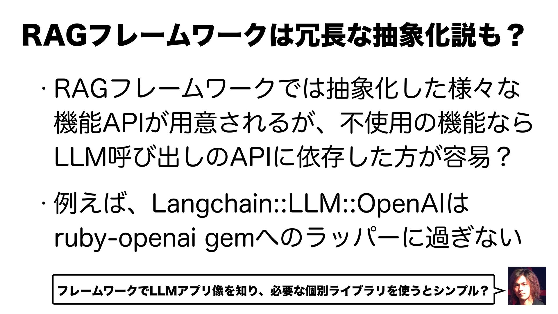 w 3"(ϑϨʔϜϫʔΫͰநԽ༷ͨ͠ʑͳ ػೳ"1*͕༻ҙ͞ΕΔ͕ɺෆ༻ͷػೳͳΒ --.ݺͼग़͠ͷ"1*ʹґଘͨ͠ํ͕༰қʁ w ྫ͑ɺ-BOHDIBJO--.0QFO"* SVCZPQFOBJHFNͷϥούʔʹա͗ͳ͍ 3"(ϑϨʔϜϫʔΫͳநԽઆʁ ϑϨʔϜϫʔΫͰ--.ΞϓϦ૾ΛΓɺඞཁͳݸผϥΠϒϥϦΛ͏ͱγϯϓϧʁ