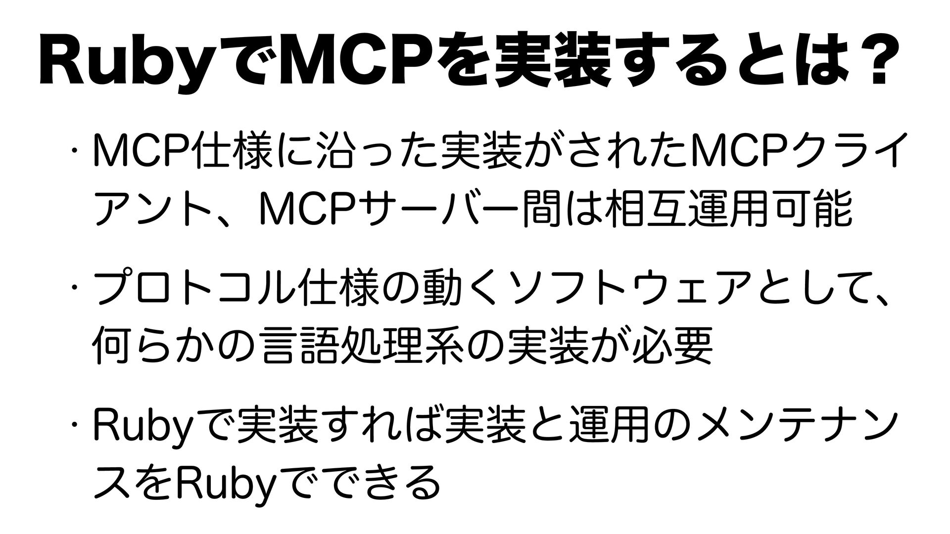 3VCZͰ.$1Λ࣮͢Δͱʁ w .$1༷ʹԊ࣮͕ͬͨ͞Εͨ.$1ΫϥΠ Ξϯτɺ.$1αʔόʔؒ૬ޓӡ༻Մೳ w ϓϩτίϧ༷ͷಈ͘ιϑτΣΞͱͯ͠ɺ ԿΒ͔ͷݴޠॲཧܥͷ࣮͕ඞཁ w 3VCZͰ࣮͢Ε࣮ͱӡ༻ͷϝϯςφϯ εΛ3VCZͰͰ͖Δ