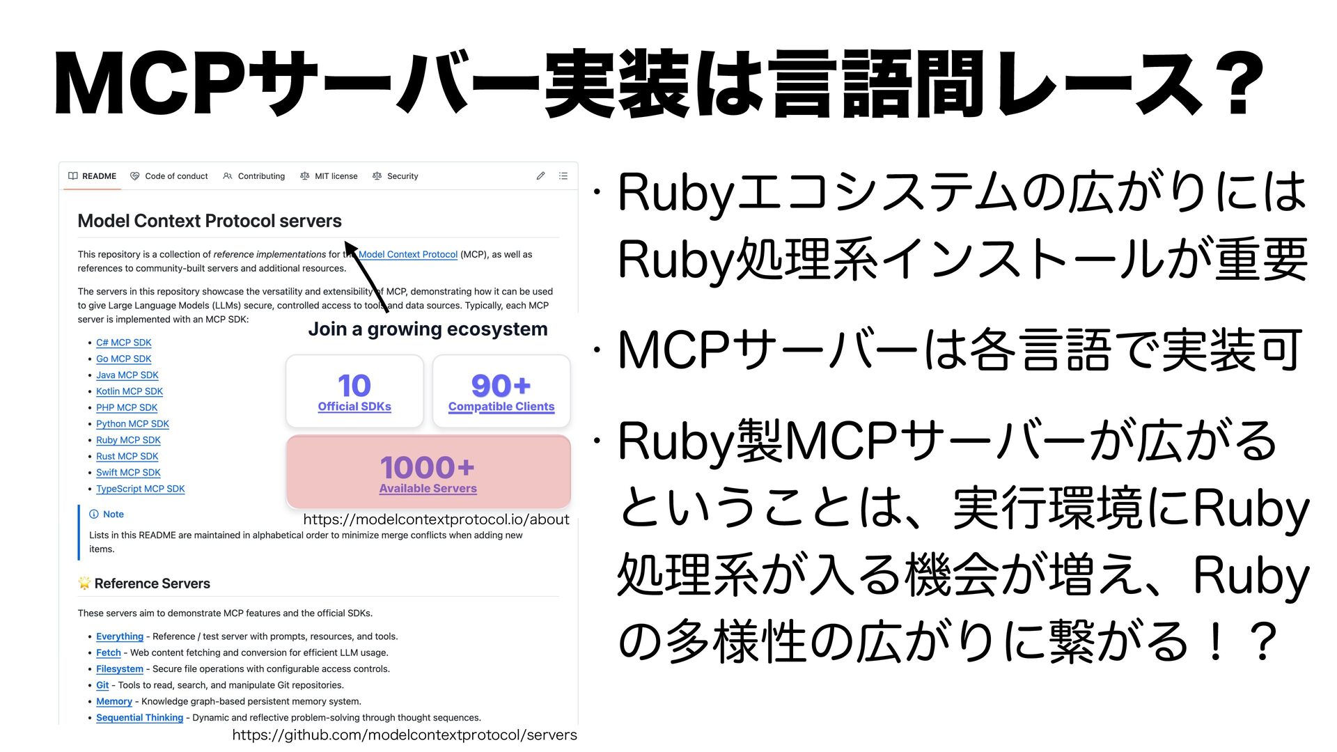 w 3VCZΤίγεςϜͷ͕Γʹ 3VCZॲཧܥΠϯετʔϧ͕ॏཁ w .$1αʔόʔ֤ݴޠͰ࣮Մ w 3VCZ.$1αʔόʔ͕͕Δ ͱ͍͏͜ͱɺ࣮ߦڥʹ3VCZ ॲཧܥ͕ೖΔػձ͕૿͑ɺ3VCZ ͷଟ༷ੑͷ͕Γʹܨ͕Δʂʁ