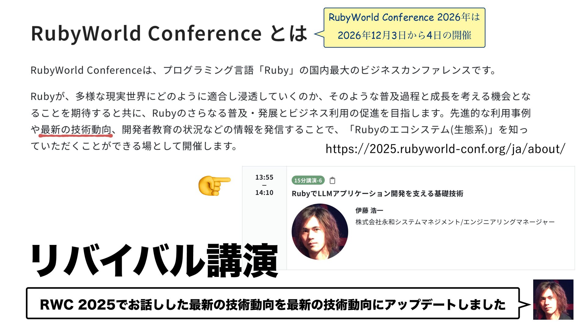 ☝ 38$Ͱ͓ͨ͠͠࠷৽ͷٕज़ಈΛ࠷৽ͷٕज़ಈʹΞοϓσʔτ͠·ͨ͠ IUUQTSVCZXPSMEDPOGPSHKBBCPVU ϦόΠόϧߨԋ RubyWorld Conference 2026 202612݄3͔Β4ͷ։࠵