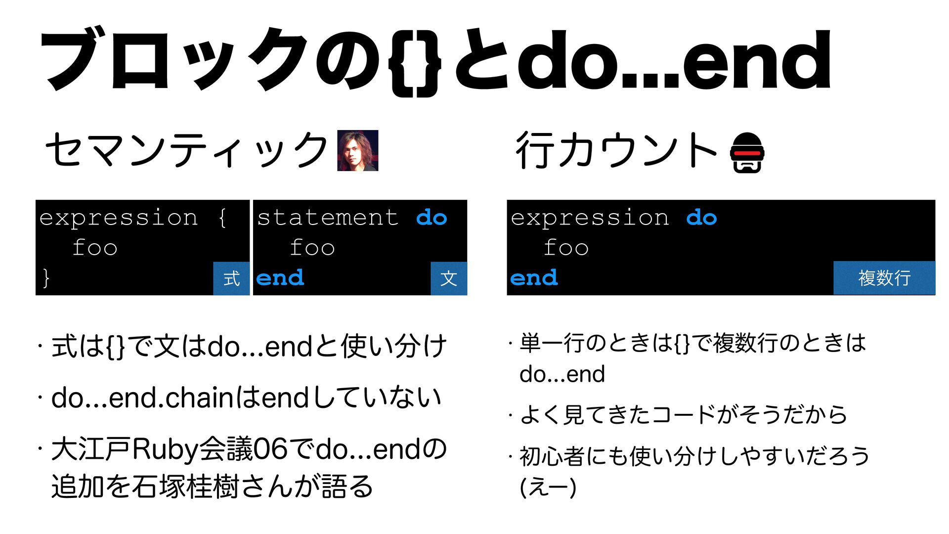 EPFOEDIBJOFOE͍ͯ͠ͳ͍ w େߐށ3VCZձٞͰEPFOEͷ ՃΛੴ௩ܡथ͞Μ͕ޠΔ expression do foo end w ୯Ұߦͷͱ͖\^Ͱෳߦͷͱ͖ EPFOE w Α͘ݟ͖ͯͨίʔυ͕ͦ͏͔ͩΒ w ॳ৺ऀʹ͍͚͍ͩ͢͠Ζ͏ ͑ʔ statement do foo end ࣜ จ ෳߦ