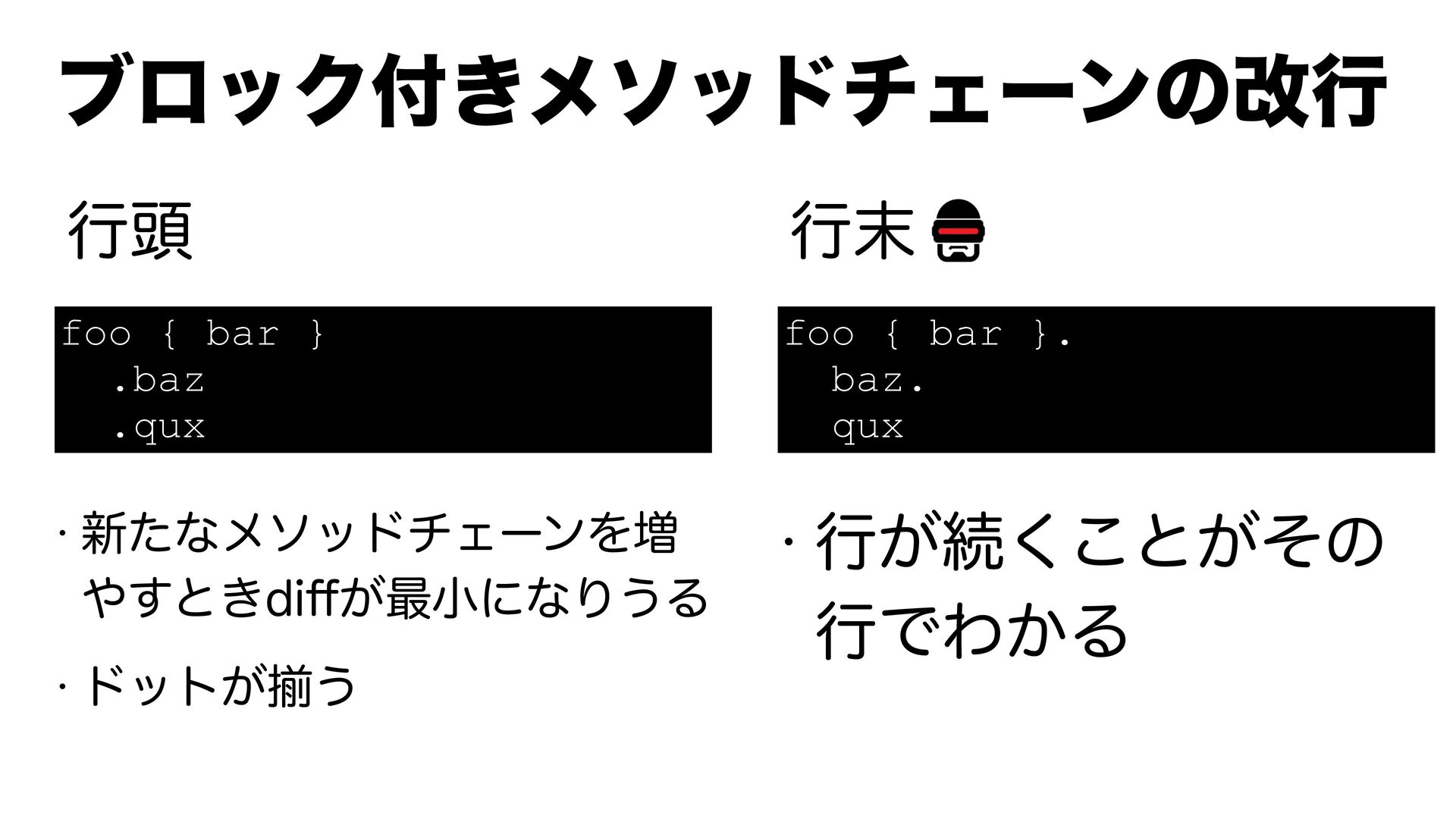 ϒϩοΫ͖ϝιουνΣʔϯͷվߦ foo { bar }.baz.qux ϒϩοΫͰվߦ w ͦͦυοτͰվߦ͠ͳ ͍ w