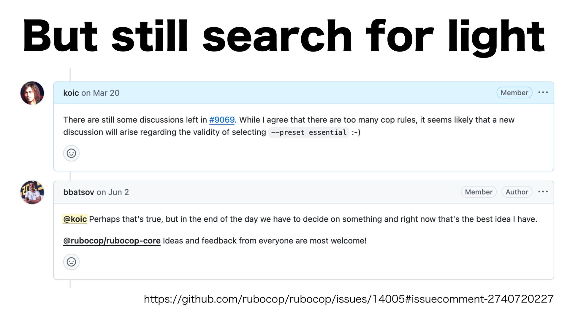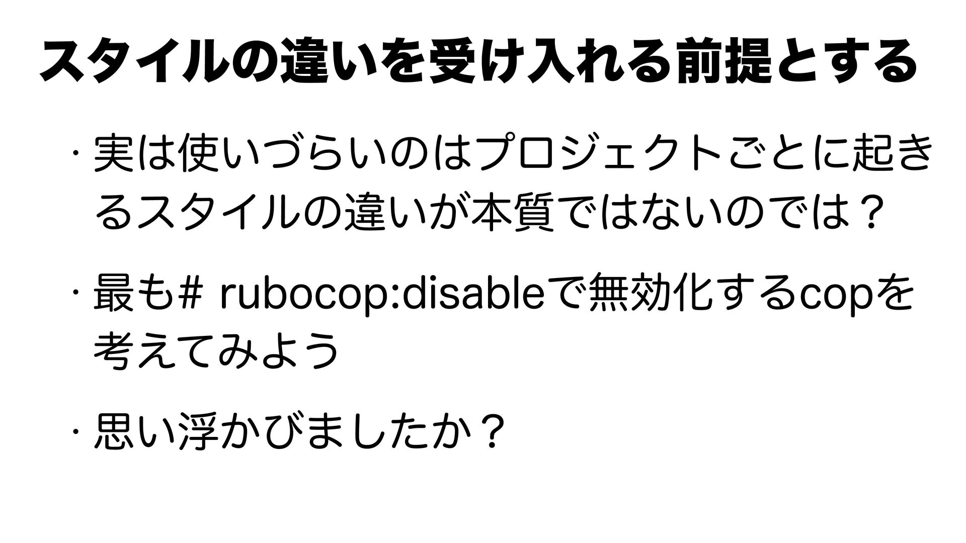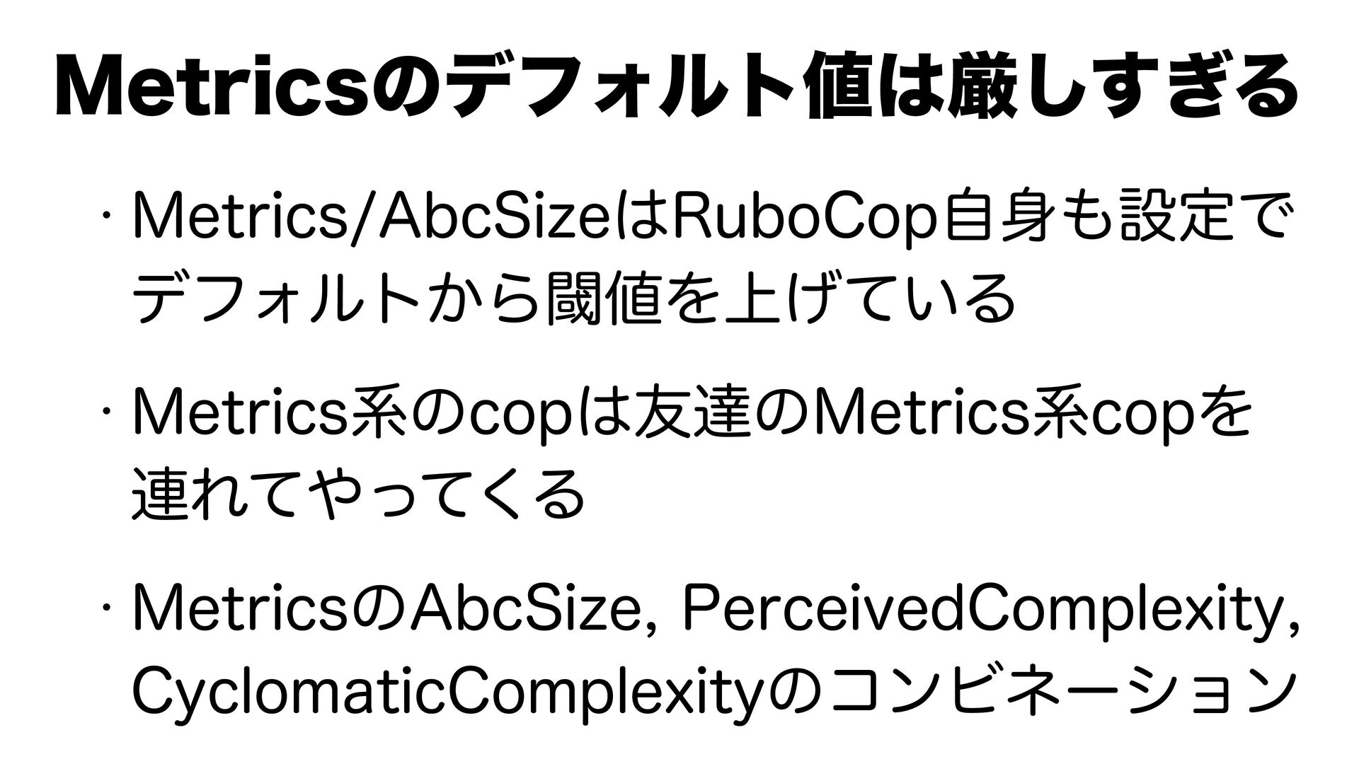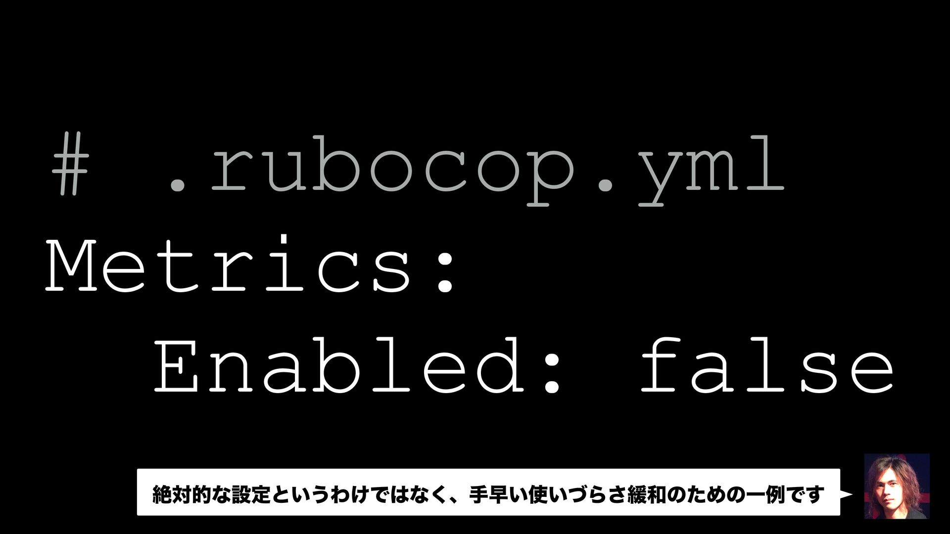 # .rubocop.yml Metrics: Enabled: false ઈରతͳઃఆͱ͍͏Θ͚Ͱͳ͘ɺखૣ͍͍ͮΒ͞؇ͷͨΊͷҰྫͰ͢