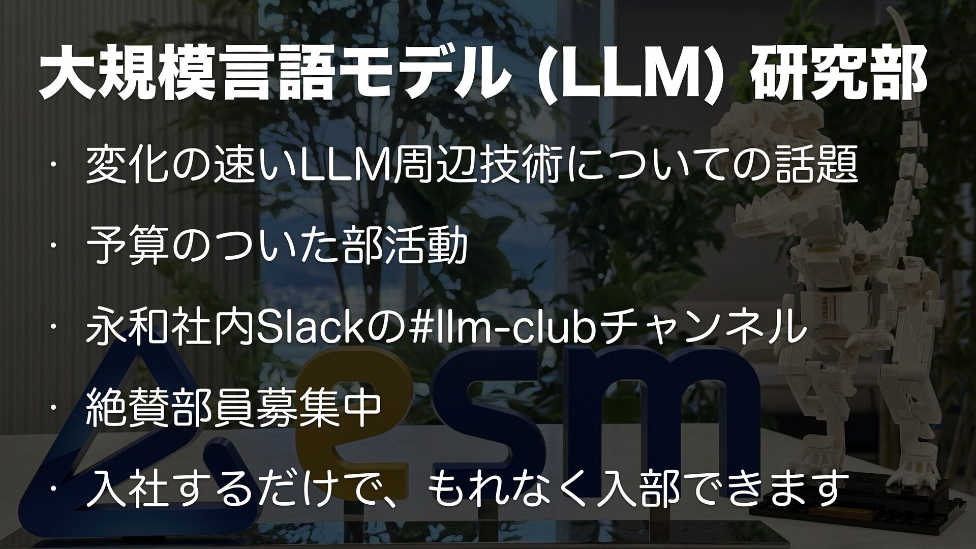 w มԽͷ͍--.पลٕज़ʹ͍ͭͯͷ w ༧ࢉͷ͍ͭͨ෦׆ಈ w Ӭࣾ4MBDLͷMMNDMVCνϟϯωϧ w ઈࢍ෦һืूத w ೖࣾ͢Δ͚ͩͰɺΕͳ͘ೖ෦Ͱ͖·͢
