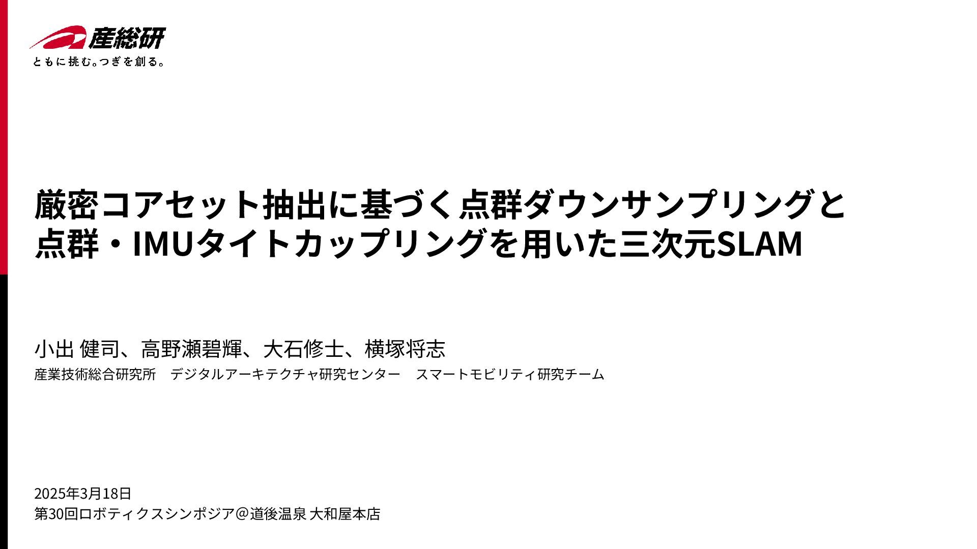 2025年3月18日 第30回ロボティクスシンポジア@道後温泉 大和屋本店 厳密コアセット抽出に基づく点群ダウンサンプリングと 点群・IMUタイトカップリングを用いた三次元SLAM 小出 健司、高野瀬碧輝、大石修士、横塚将志 産業技術総合研究所 デジタルアーキテクチャ研究センター スマートモビリティ研究チーム