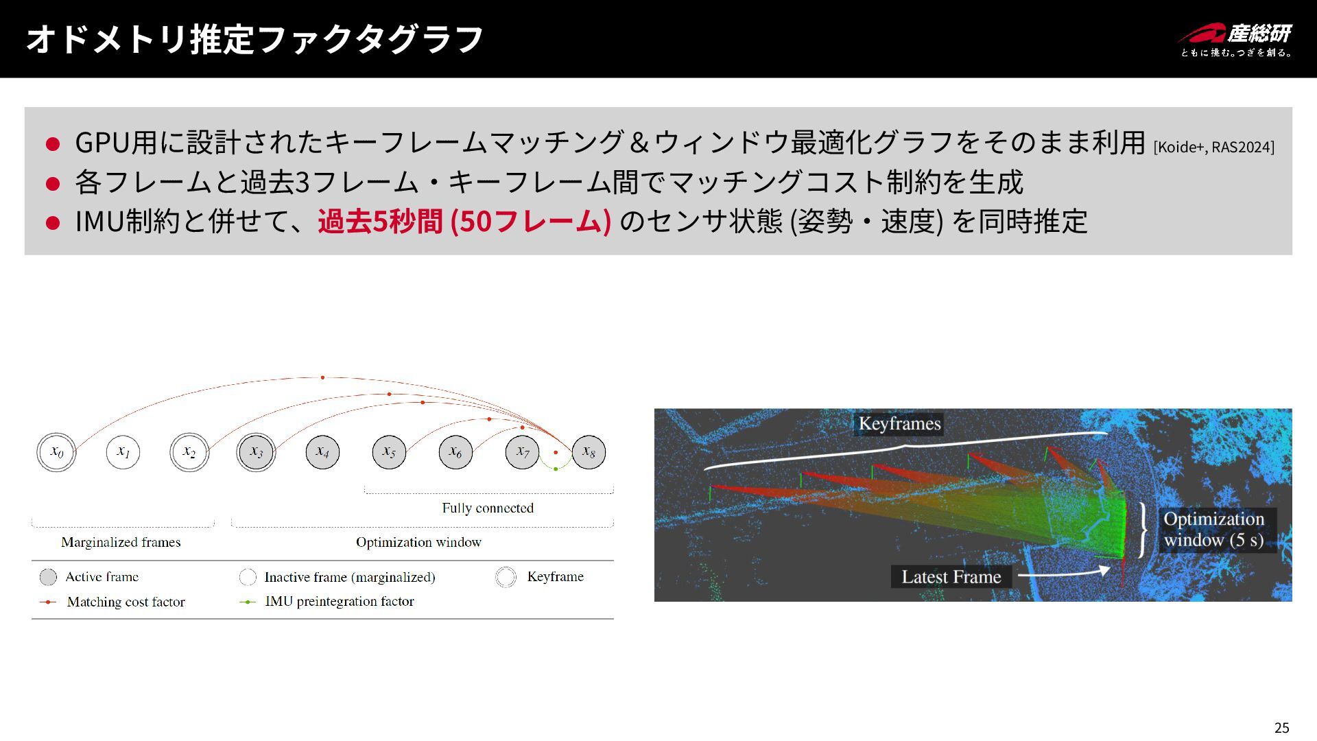 25 オドメトリ推定ファクタグラフ ⚫ GPU用に設計されたキーフレームマッチング&ウィンドウ最適化グラフをそのまま利用 [Koide+, RAS2024] ⚫ 各フレームと過去3フレーム・キーフレーム間でマッチングコスト制約を生成 ⚫ IMU制約と併せて、過去5秒間