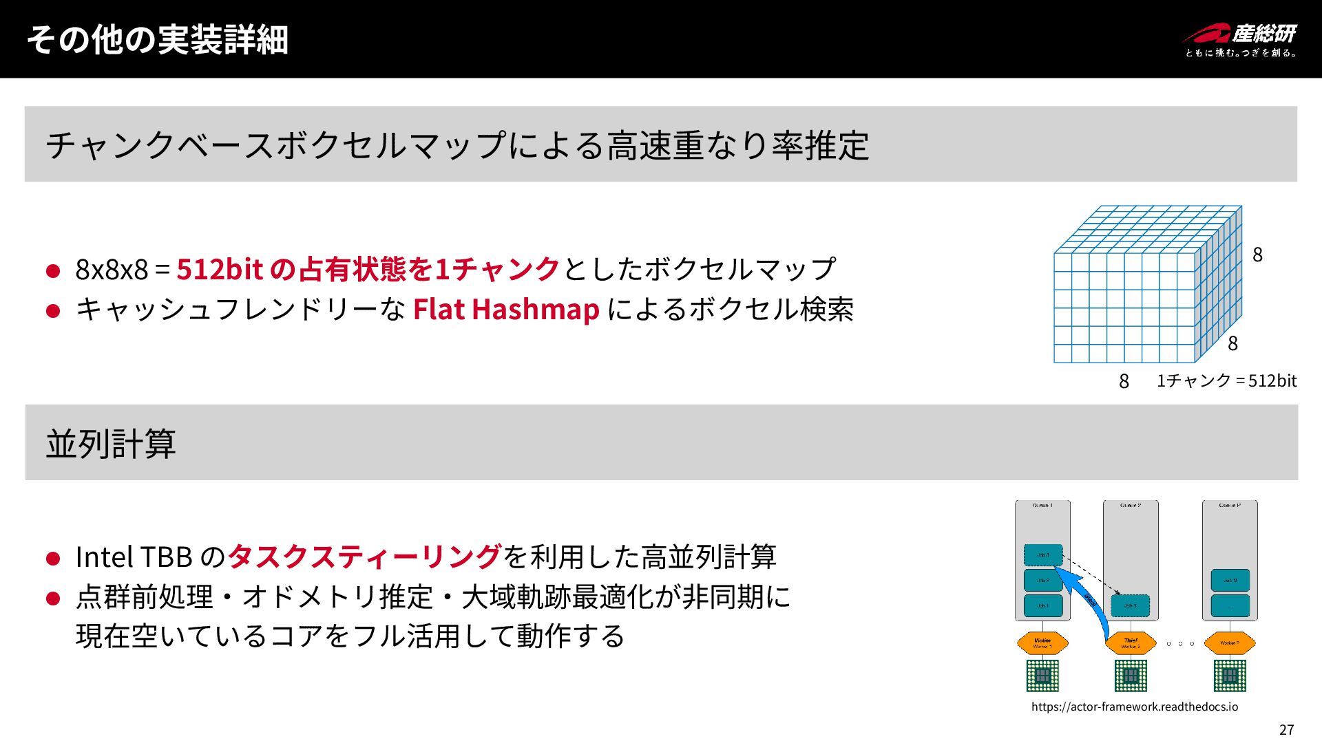512bit の占有状態を1チャンクとしたボクセルマップ ⚫ キャッシュフレンドリーな Flat Hashmap によるボクセル検索 ⚫ Intel TBB のタスクスティーリングを利用した高並列計算 ⚫ 点群前処理・オドメトリ推定・大域軌跡最適化が非同期に 現在空いているコアをフル活用して動作する https://actor-framework.readthedocs.io 1チャンク = 512bit