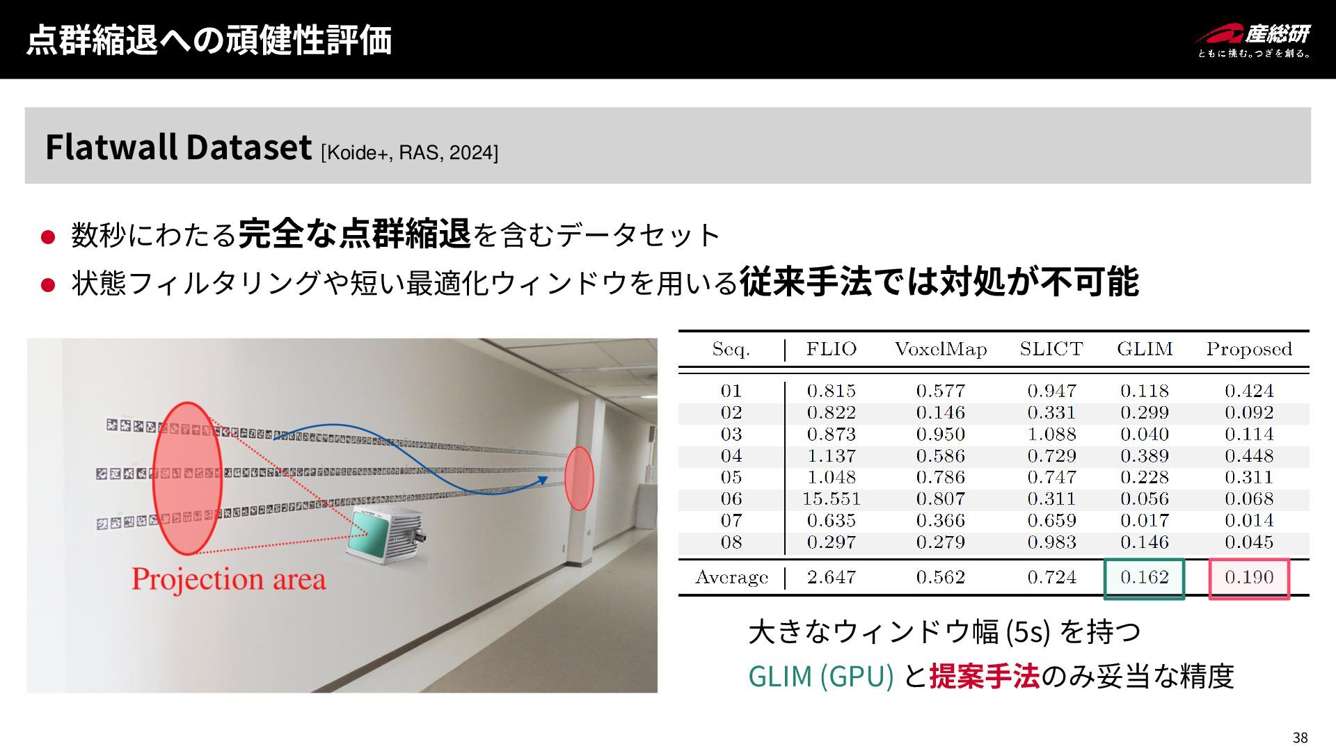⚫ 状態フィルタリングや短い最適化ウィンドウを用いる従来手法では対処が不可能 Flatwall Dataset [Koide+, RAS, 2024]