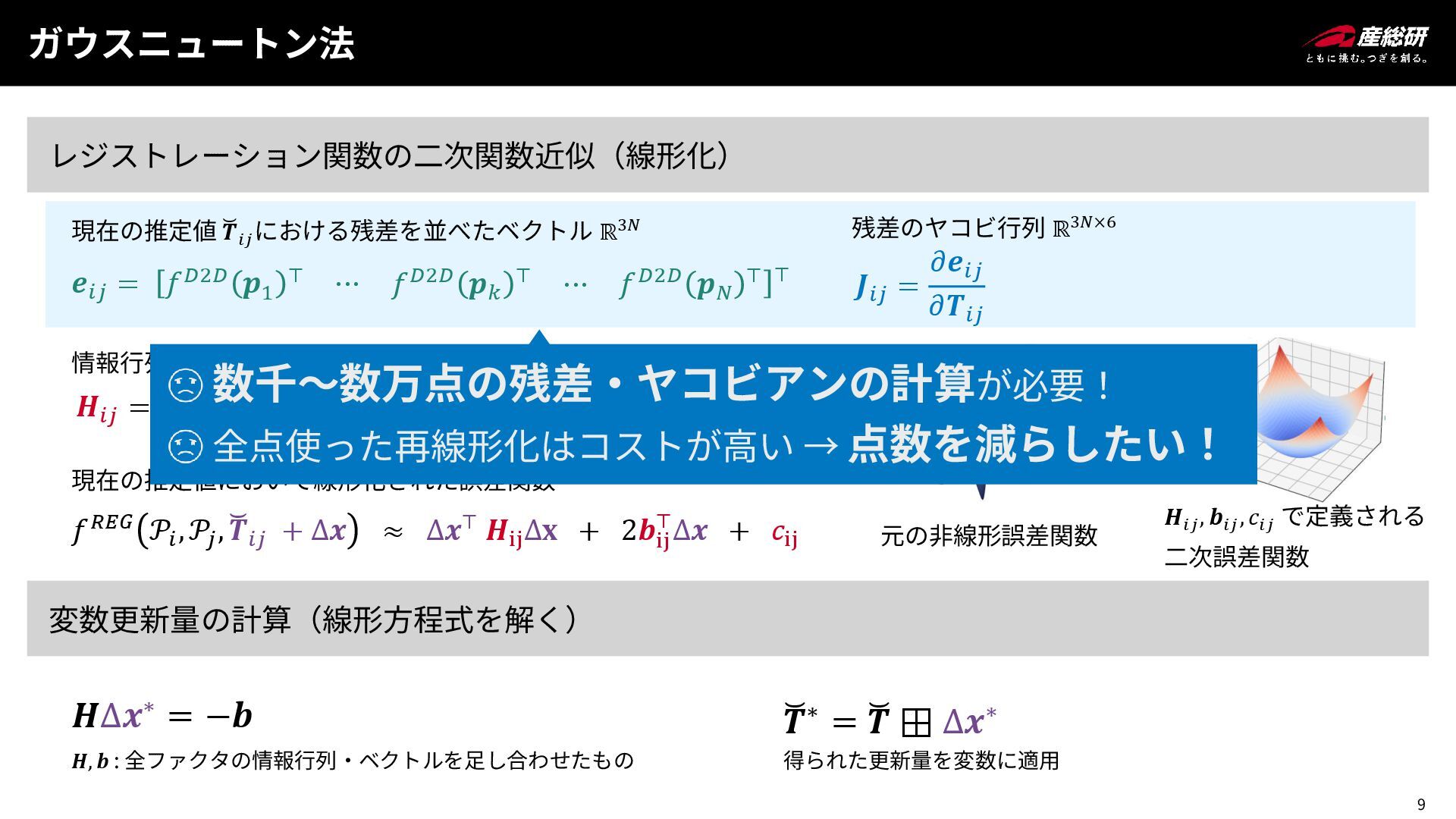 ガウスニュートン法 レジストレーション関数の二次関数近似(線形化) 𝑱𝑖𝑗 = 𝜕𝒆𝑖𝑗 𝜕𝑻𝑖𝑗 𝒆𝑖𝑗 = 𝑓𝐷2𝐷 𝒑1 ⊤ ⋯ 𝑓𝐷2𝐷 𝒑𝑘 ⊤ ⋯ 𝑓𝐷2𝐷 𝒑𝑁 ⊤ ⊤ 変数更新量の計算(線形方程式を解く) 𝑯Δ𝒙∗ = −𝒃 𝑻∗ = 𝑻 ⊞ Δ𝒙∗ 𝑯, 𝒃 : 全ファクタの情報行列・ベクトルを足し合わせたもの 得られた更新量を変数に適用 現在の推定値 𝑻𝑖𝑗 における残差を並べたベクトル ℝ3𝑁 残差のヤコビ行列 ℝ3𝑁×6 𝑯𝑖𝑗 = 𝑱𝑖𝑗 ⊤ 𝑱𝑖𝑗 𝒃𝑖𝑗 = 𝑱𝑖𝑗 𝑇 𝒆𝑖𝑗 𝑐𝑖𝑗 = 𝒆𝑖𝑗 ⊤ 𝒆𝑖𝑗 𝑓𝑅𝐸𝐺 𝒫𝑖 , 𝒫𝑗 , 𝑻𝑖𝑗 + Δ𝒙 ≈ Δ𝒙⊤ 𝑯ij Δ𝐱 + 2𝒃ij ⊤Δ𝒙 + 𝑐ij 情報行列・情報ベクトル・定数 現在の推定値において線形化された誤差関数 数千~数万点の残差・ヤコビアンの計算が必要! 全点使った再線形化はコストが高い → 点数を減らしたい!