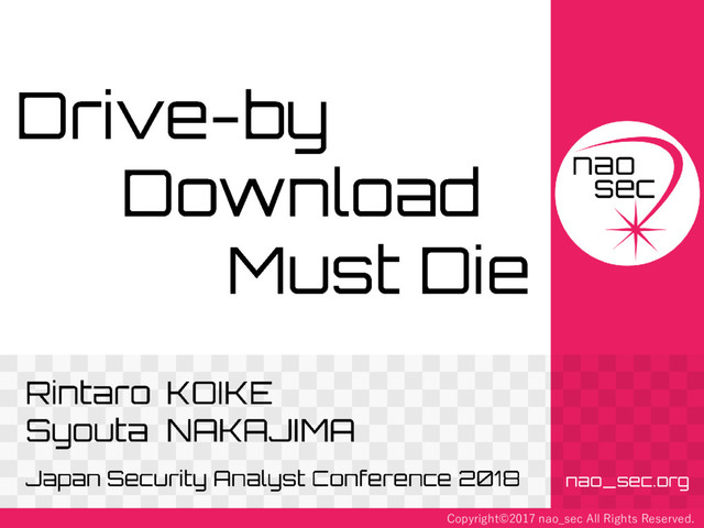 2017 • Activity • Observation and analysis of Drive-by Download Attack • Development analysis tools • Information sharing • http://nao-sec.org • https://twitter.com/nao_sec • https://github.com/nao-sec • NOT working as security engineer • Only hobby 3