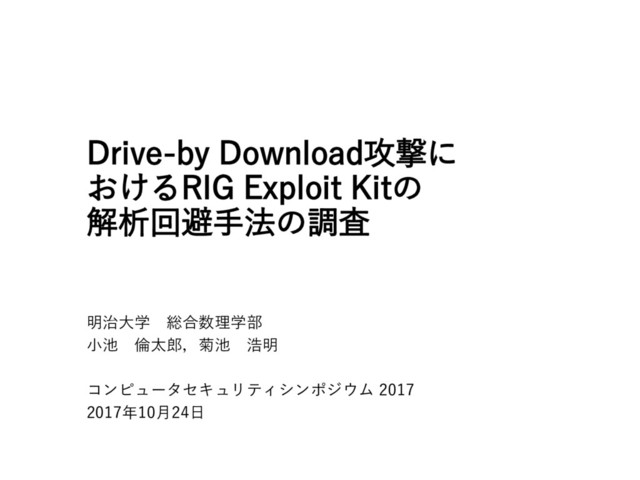 Kitが用いている解析妨害手法(攻撃コードの難読 化とアクセス制御)を明らかにし,意図的に高頻度(1分/回) でRIG Exploit Kitへアクセスを行うことで特定のIPアドレス空 間を攻撃範囲外に設定されるという仮説が成立することを確認 した • 今後の課題 • RIG Exploit Kitが特定のIPアドレス空間を攻撃対象外に設定するため に用いている要素を明らかにする • RIG Exploit Kit以外のExploit Kitについても詳細な調査を行い,有効な 防衛手法について調査する 18