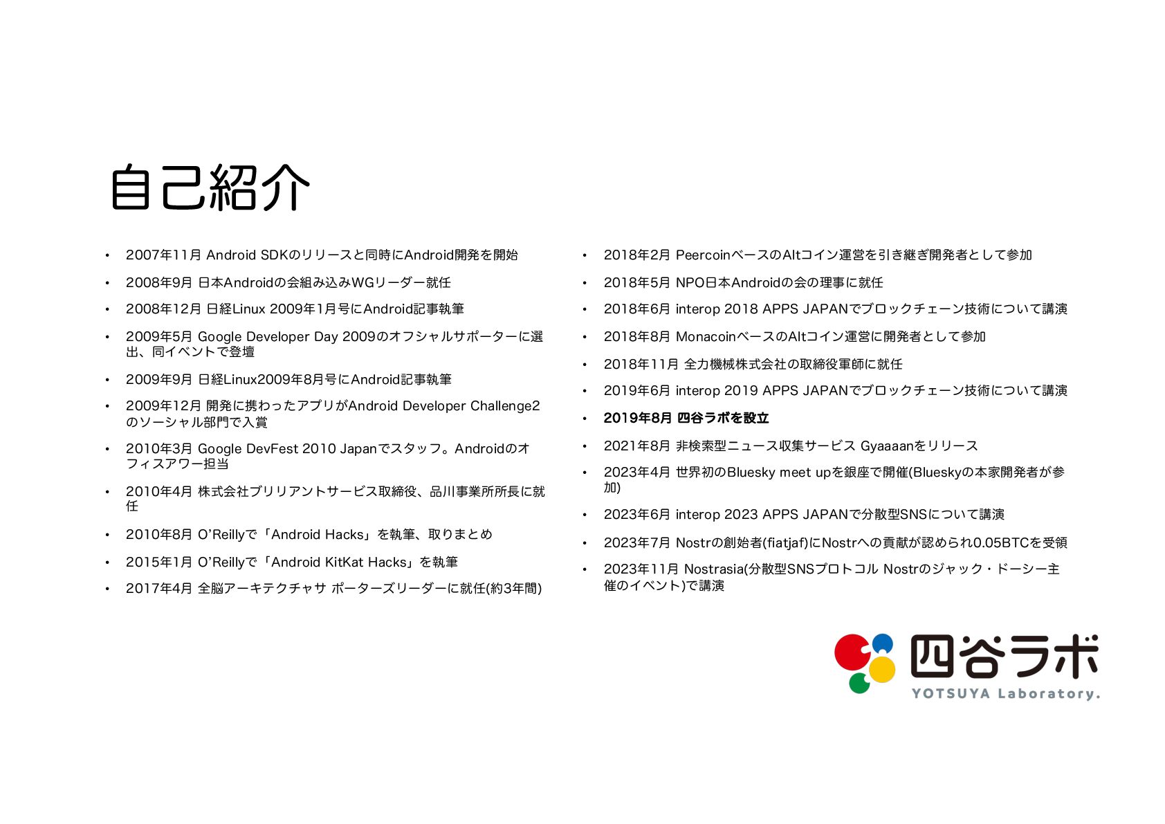݄શྗػցגࣜձࣾͷऔక܉ࢣʹब • ݄JOUFSPQ"114+"1"/ͰϒϩοΫνΣʔϯٕज़ʹ͍ͭͯߨԋ • ݄࢛୩ϥϘΛઃཱ • ݄ඇݕࡧܕχϡʔεऩूαʔϏε(ZBBBBOΛϦϦʔε • ݄ੈքॳͷ#MVFTLZNFFUVQΛۜ࠲Ͱ։࠵ #MVFTLZͷຊՈ։ൃऀ͕ࢀ Ճ • ݄JOUFSPQ"114+"1"/Ͱࢄܕ4/4ʹ͍ͭͯߨԋ • ݄/PTUSͷ࢝ऀ GJBUKBG ʹ/PTUSͷߩݙ͕ೝΊΒΕ#5$Λडྖ • ݄/PTUSBTJB ࢄܕ4/4ϓϩτίϧ/PTUSͷδϟοΫɾυʔγʔओ ࠵ͷΠϕϯτ Ͱߨԋ • ݄ "OESPJE4%,ͷϦϦʔεͱಉ࣌ʹ"OESPJE։ൃΛ։࢝ • ݄ຊ"OESPJEͷձΈࠐΈ8(Ϧʔμʔब • ݄ ܦ-JOVY݄߸ʹ"OESPJEهࣄࣥච • ݄ (PPHMF%FWFMPQFS%BZͷΦϑγϟϧαϙʔλʔʹબ ग़ɺಉΠϕϯτͰొஃ • ݄ܦ-JOVY݄߸ʹ"OESPJEهࣄࣥච • ݄ ։ൃʹܞΘͬͨΞϓϦ͕"OESPJE%FWFMPQFS$IBMMFOHF ͷιʔγϟϧ෦Ͱೖ • ݄ (PPHMF%FW'FTU +BQBOͰελοϑɻ"OESPJEͷΦ ϑΟεΞϫʔ୲ • ݄גࣜձࣾϒϦϦΞϯταʔϏεऔకɺࣄۀॴॴʹब • ݄ 0`3FJMMZͰʮ"OESPJE)BDLTʯΛࣥචɺऔΓ·ͱΊ • ݄ 0`3FJMMZͰʮ"OESPJE,JU,BU)BDLTʯΛࣥච • ݄ શΞʔΩςΫνϟα ϙʔλʔζϦʔμʔʹब ؒ