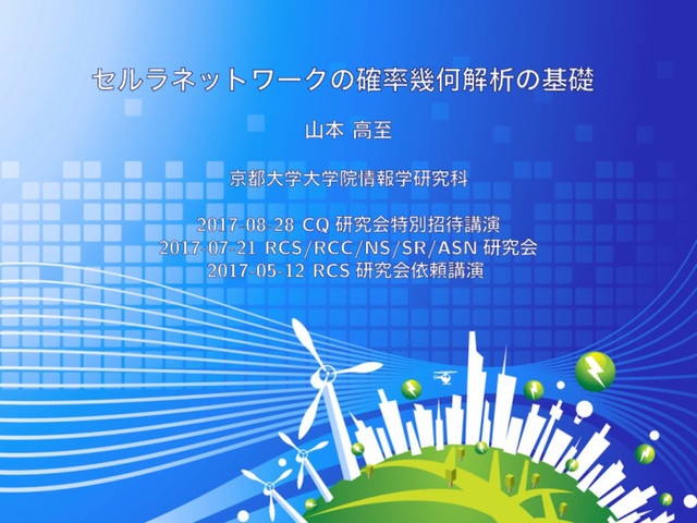 G., Baccelli, F., and Ganti, R. K. (2011). A tractable approach to coverage and rate in cellular networks. IEEE Trans. Commun., 59(11):3122–3134. [Baddeley et al., 2015] Baddeley, A., Rubak, E., and Turner, R. (2015). Spatial Point Patterns: Methodology and Applications with R. CRC Pr. [ElSawy et al., 2013] ElSawy, H., Hossain, E., and Haenggi, M. (2013). Stochastic geometry for modeling, analysis, and design of multi-tier and cognitive cellular wireless networks: A survey. IEEE Commun. Surveys Tuts., 15(3):996–1019. [ElSawy et al., 2017] ElSawy, H., Sultan-Salem, A., Alouini, M.-S., and Win, M. Z. (2017). Modeling and analysis of cellular networks using stochastic geometry: A tutorial. IEEE Commun. Surveys Tuts., 19(1):167–203. [Gradshteyn and Ryzhik, 2014] Gradshteyn, I. S. and Ryzhik, I. M. (2014). Table of Integrals, Series, and Products. Academic Pr., 8th edition. [Haenggi, 2012] Haenggi, M. (2012). Stochastic Geometry for Wireless Networks. Cambridge Univ. Press, Cambridge, U.K. [Hayashi and Luo, 2009] Hayashi, S. and Luo, Z.-Q. (2009). Spectrum management for interference-limited multiuser communication systems. IEEE Trans. Inf. Theory, 55(3):1153–1175. [Raniwala et al., 2004] Raniwala, A., Gopalan, K., and Chiueh, T.-c. (2004). Centralized channel assignment and routing algorithms for multi-channel wireless mesh networks. ACM SIGMOBILE Mobile Comp. Commun. Rev., 8(2):50. http://bit.ly/RCS201705 38 / 38