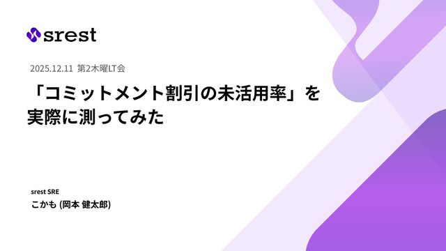 「コミットメント割引の未活⽤率」を 実際に測ってみた 2025.12.11 第2⽊曜LT会 srest SRE こかも (岡本 健太郎)