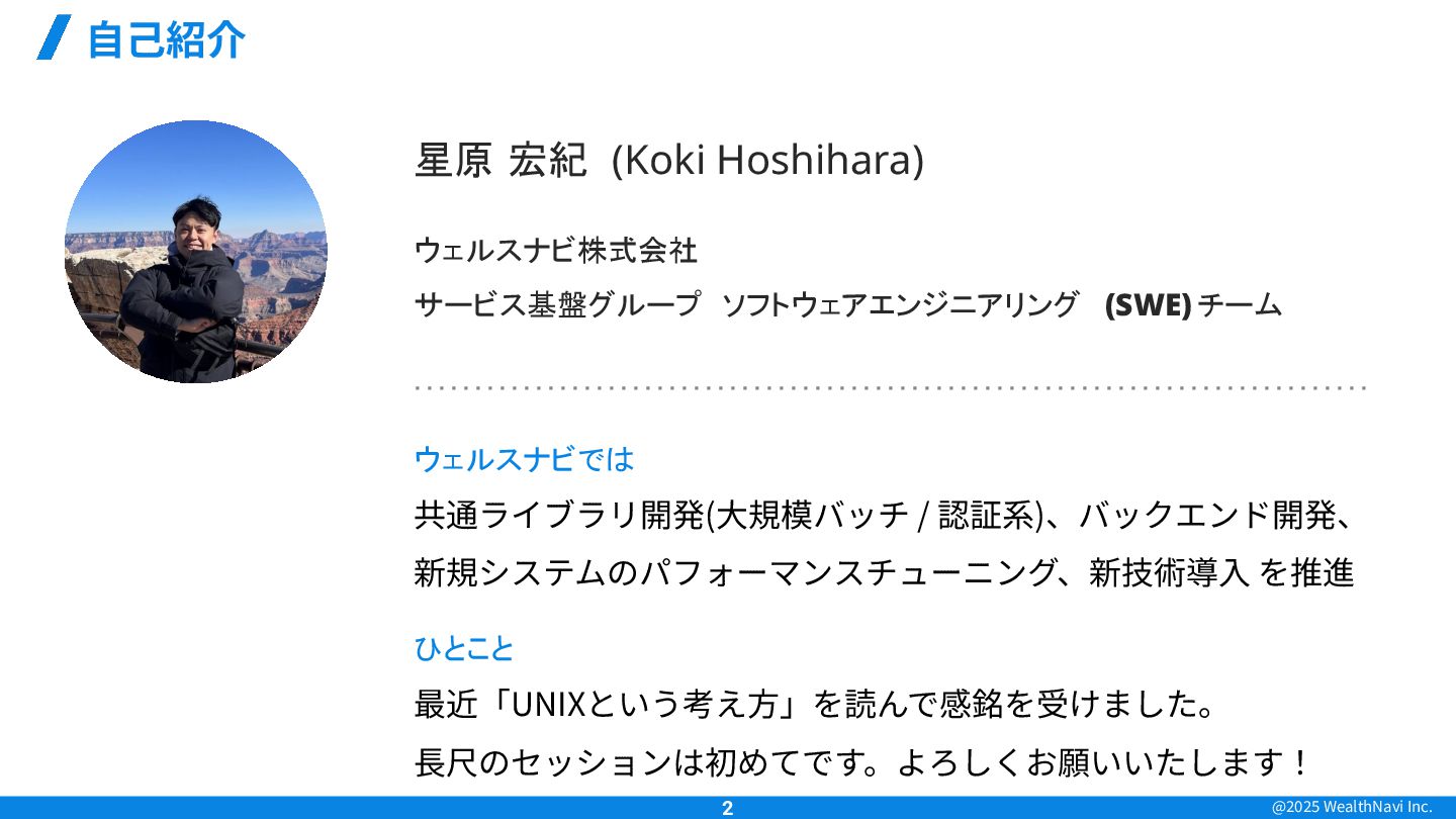 ⾃⼰紹介 2 ひとこと 最近「UNIXという考え⽅」を読んで感銘を受けました。 ⻑尺のセッションは初めてです。よろしくお願いいたします! ウェルスナビでは 共通ライブラリ開発(⼤規模バッチ / 認証系)、バックエンド開発、 新規システムのパフォーマンスチューニング、新技術導⼊ を推進