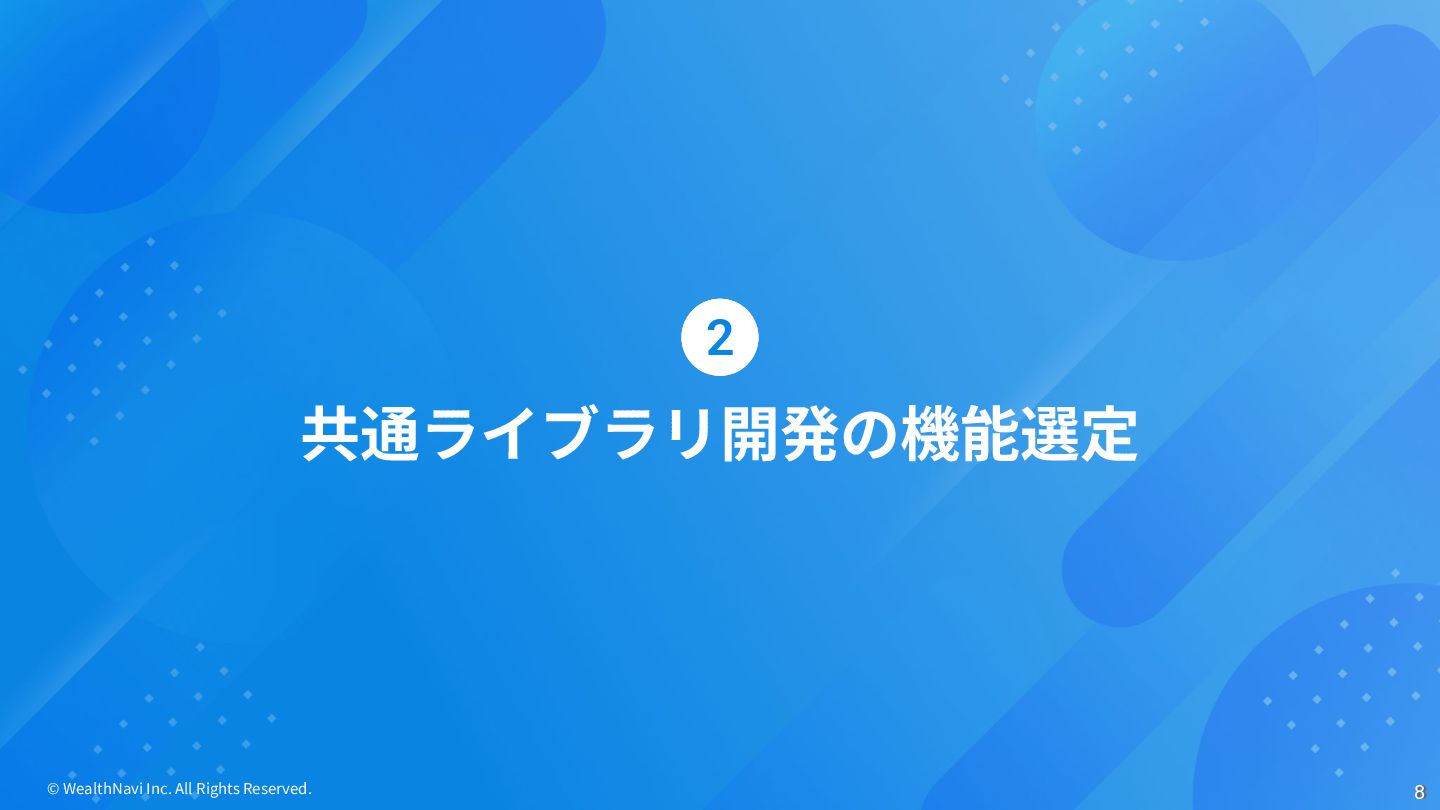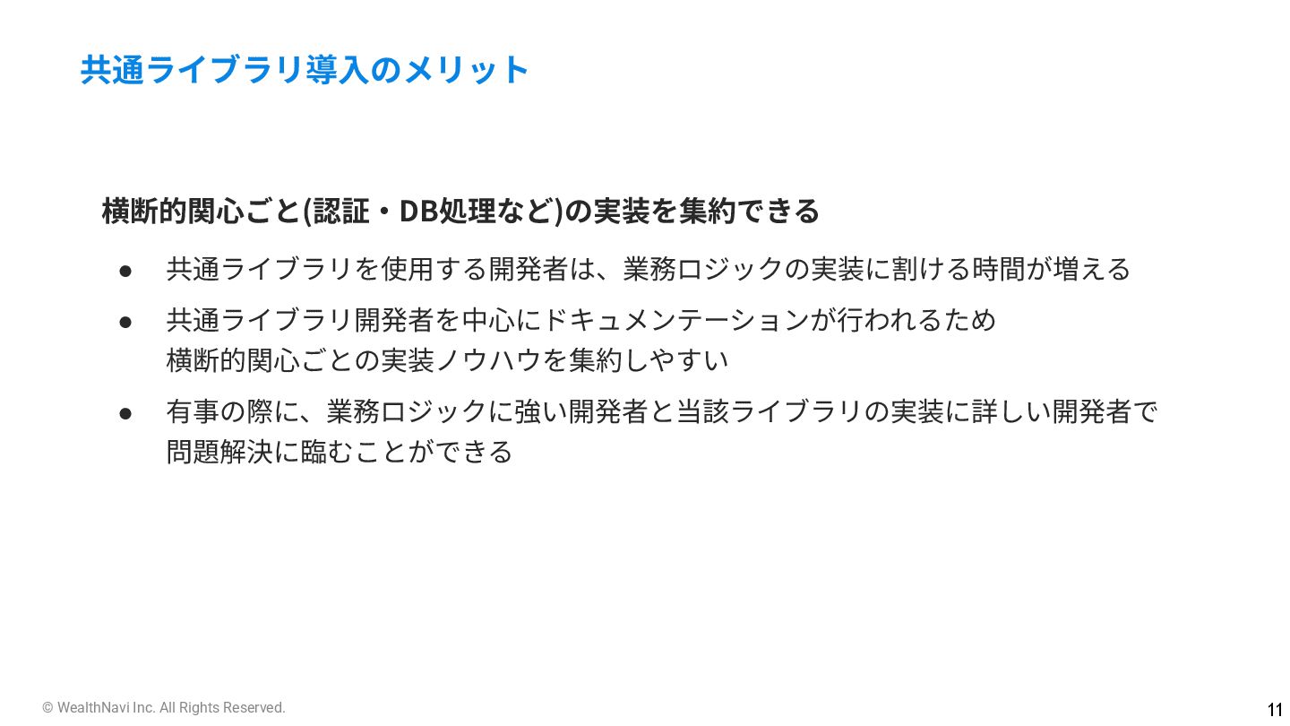 7. © WealthNavi Inc. All Rights Reserved. 11 共通ライブラリ導⼊のメリット 横断的関⼼ごと(認証‧DB処理など)の実装を集約できる •