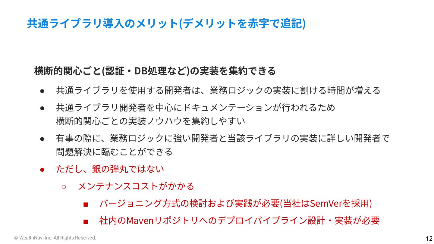 8. © WealthNavi Inc. All Rights Reserved. 12 共通ライブラリ導⼊のメリット(デメリットを⾚字で追記) 横断的関⼼ごと(認証‧DB処理など)の実装を集約できる •