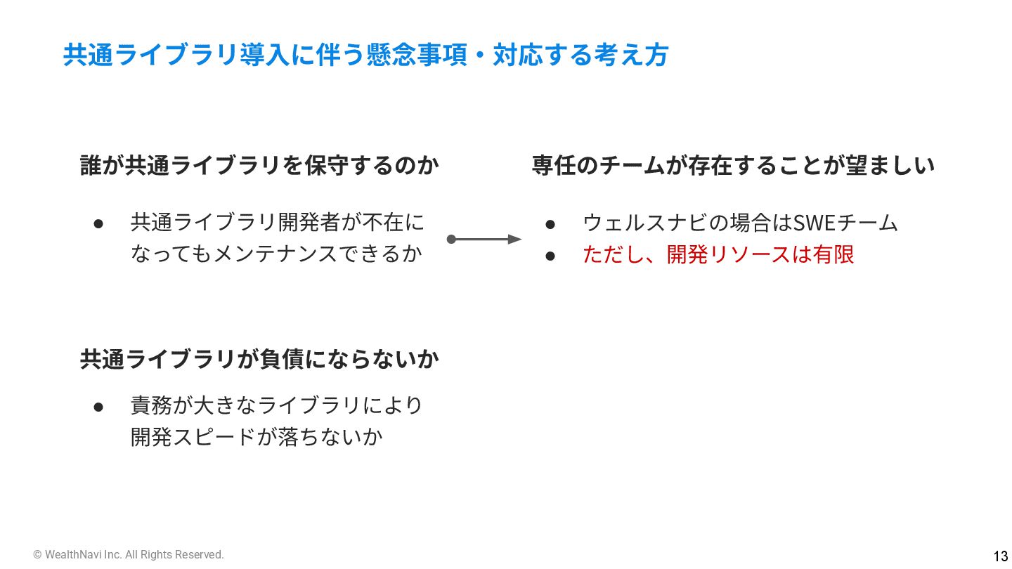 9. © WealthNavi Inc. All Rights Reserved. 13 共通ライブラリ導⼊に伴う懸念事項‧対応する考え⽅ 専任のチームが存在することが望ましい 誰が共通ライブラリを保守するのか