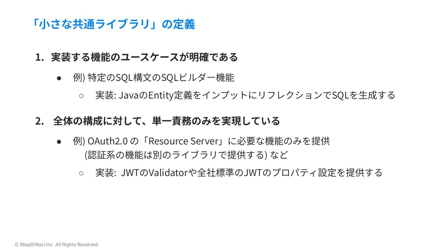 11. © WealthNavi Inc. All Rights Reserved. 「⼩さな共通ライブラリ」の定義 • 例) 特定のSQL構⽂のSQLビルダー機能