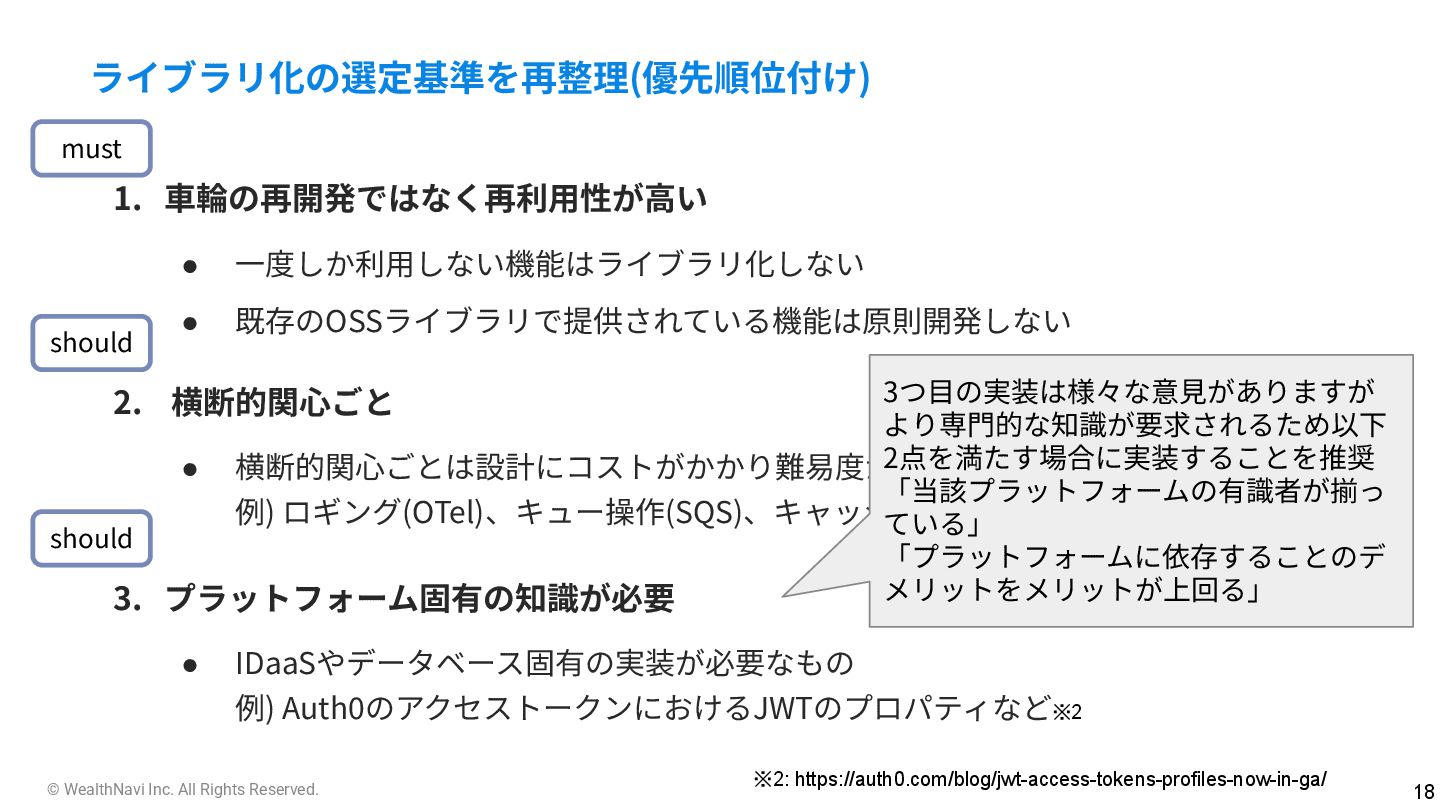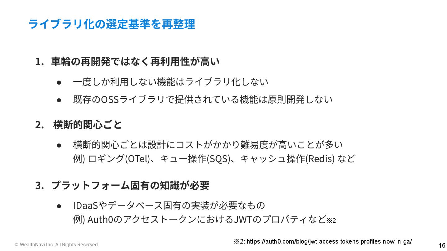 14. © WealthNavi Inc. All Rights Reserved. 18 ライブラリ化の選定基準を再整理(優先順位付け) ※2: https://auth0.com/blog/jwt-access-tokens-profiles-now-in-ga/