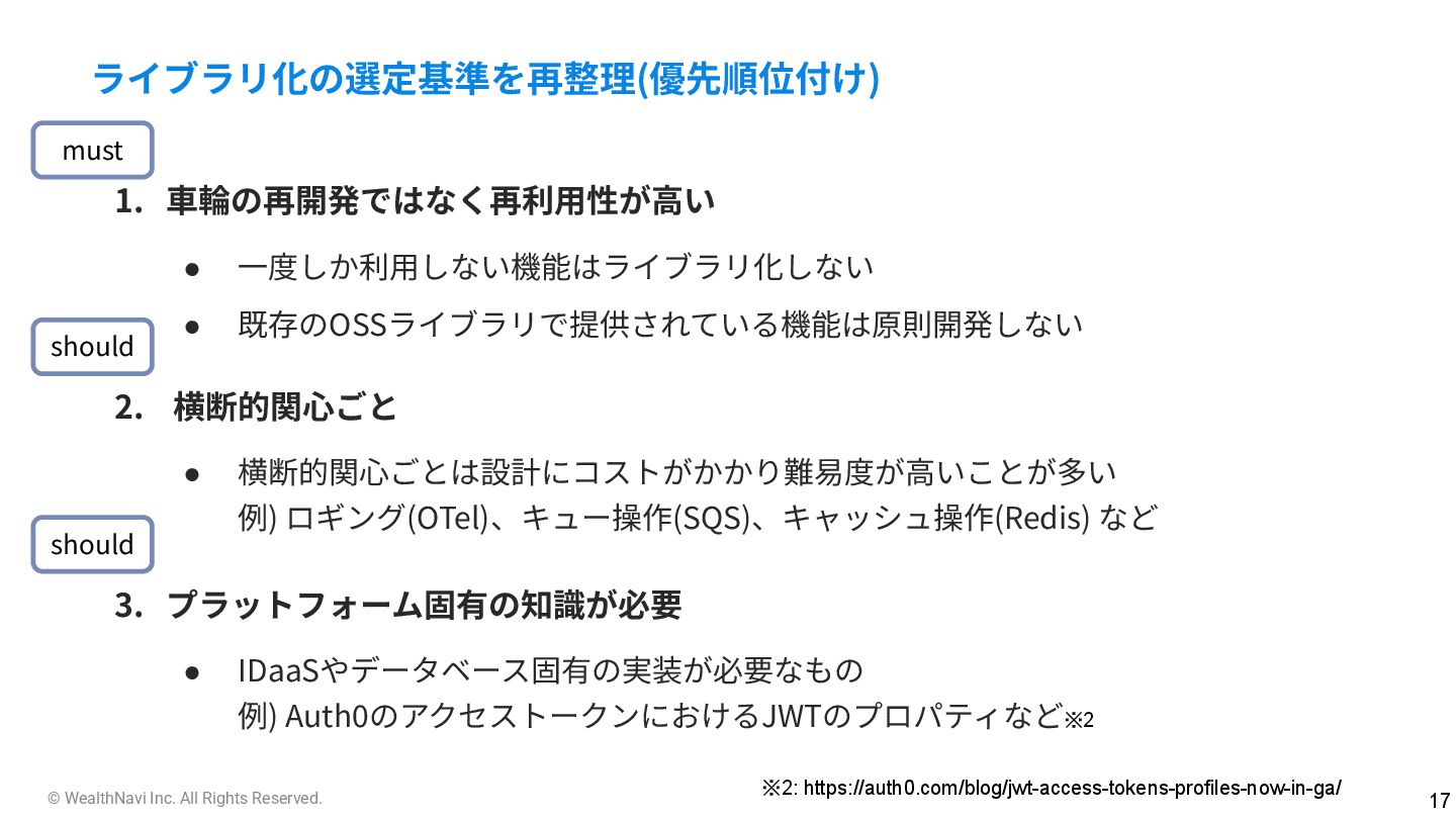 • ⼀度しか利⽤しない機能はライブラリ化しない • 既存のOSSライブラリで提供されている機能は原則開発しない 1. ⾞輪の再開発ではなく再利⽤性が⾼い • 横断的関⼼ごとは設計にコストがかかり難易度が⾼いことが多い 例) ロギング(OTel)、キュー操作(SQS)、キャッシュ操作(Redis) など 2. 横断的関⼼ごと • IDaaSやデータベース固有の実装が必要なもの 例) Auth0のアクセストークンにおけるJWTのプロパティなど※2 3. プラットフォーム固有の知識が必要 3つ⽬の実装は様々な意⾒がありますが より専⾨的な知識が要求されるため以下 2点を満たす場合に実装することを推奨 「当該プラットフォームの有識者が揃っ ている」 「プラットフォームに依存することのデ メリットをメリットが上回る」 should must should