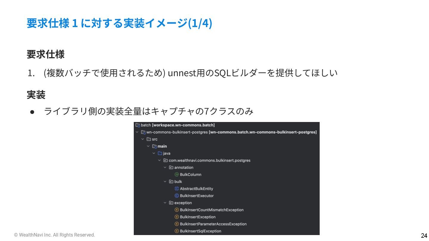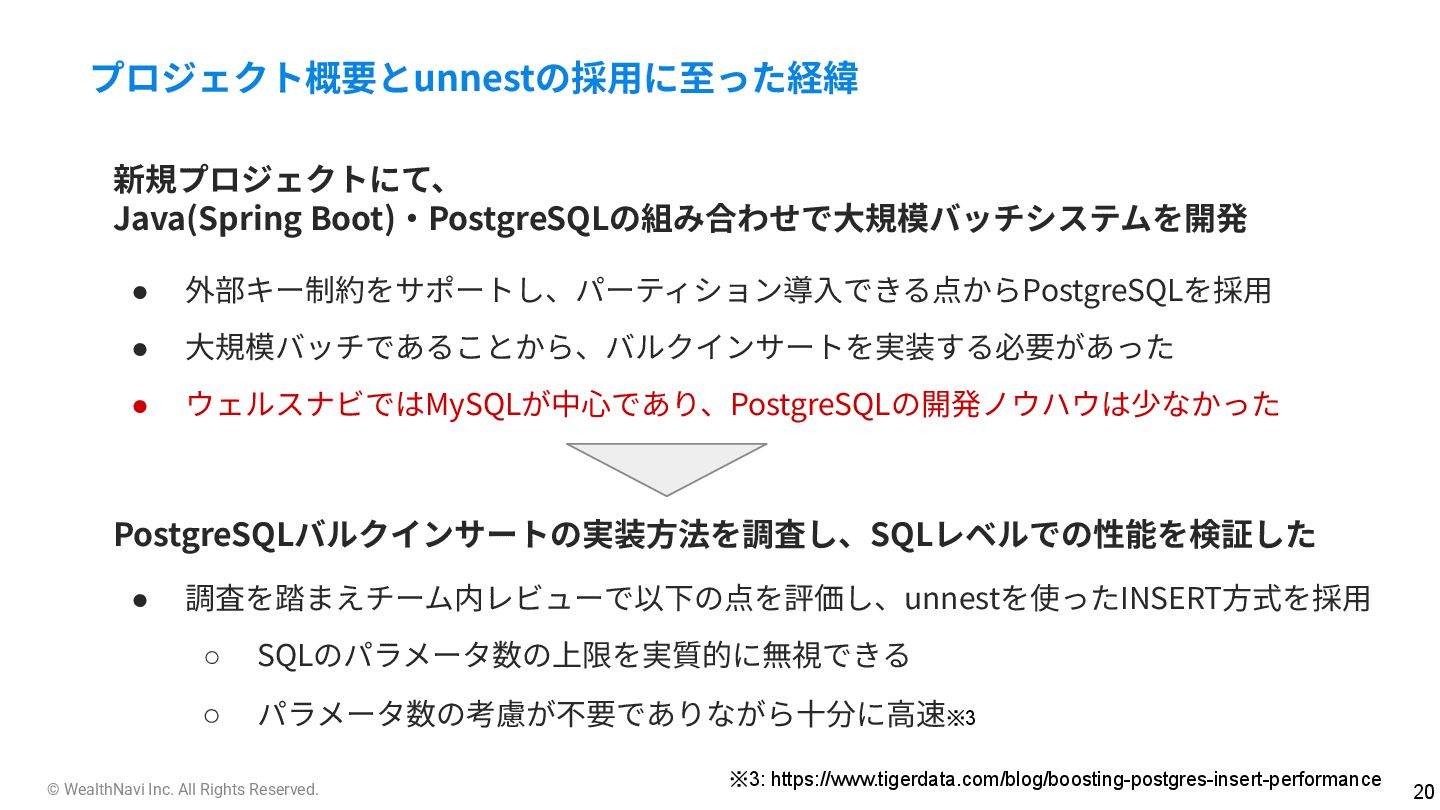 • ⼤規模バッチであることから、バルクインサートを実装する必要があった • ウェルスナビではMySQLが中⼼であり、PostgreSQLの開発ノウハウは少なかった 新規プロジェクトにて、 Java(Spring Boot)‧PostgreSQLの組み合わせで⼤規模バッチシステムを開発 • 調査を踏まえチーム内レビューで以下の点を評価し、unnestを使ったINSERT⽅式を採⽤ ◦ SQLのパラメータ数の上限を実質的に無視できる ◦ パラメータ数の考慮が不要でありながら⼗分に⾼速※3 PostgreSQLバルクインサートの実装⽅法を調査し、SQLレベルでの性能を検証した ※3: https://www.tigerdata.com/blog/boosting-postgres-insert-performance