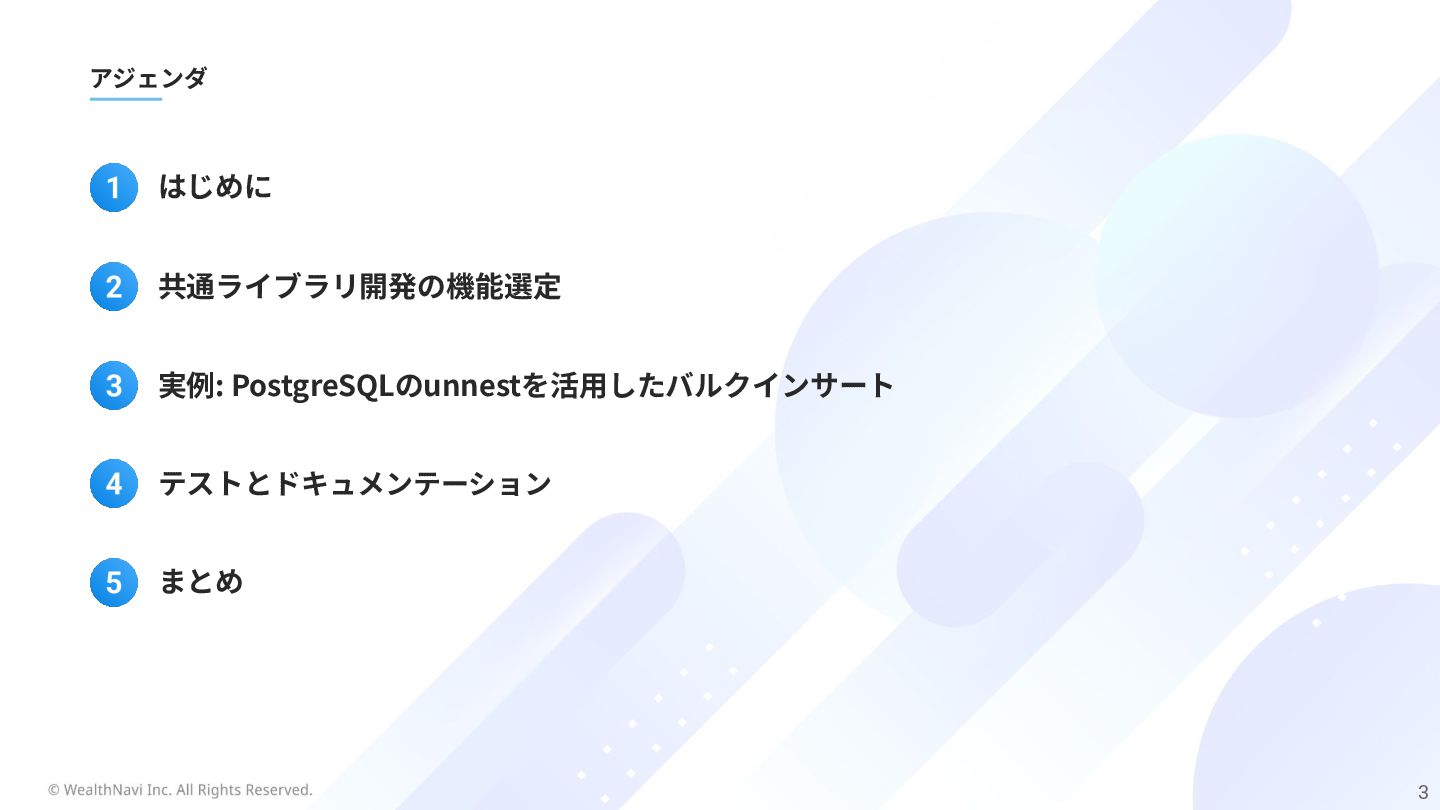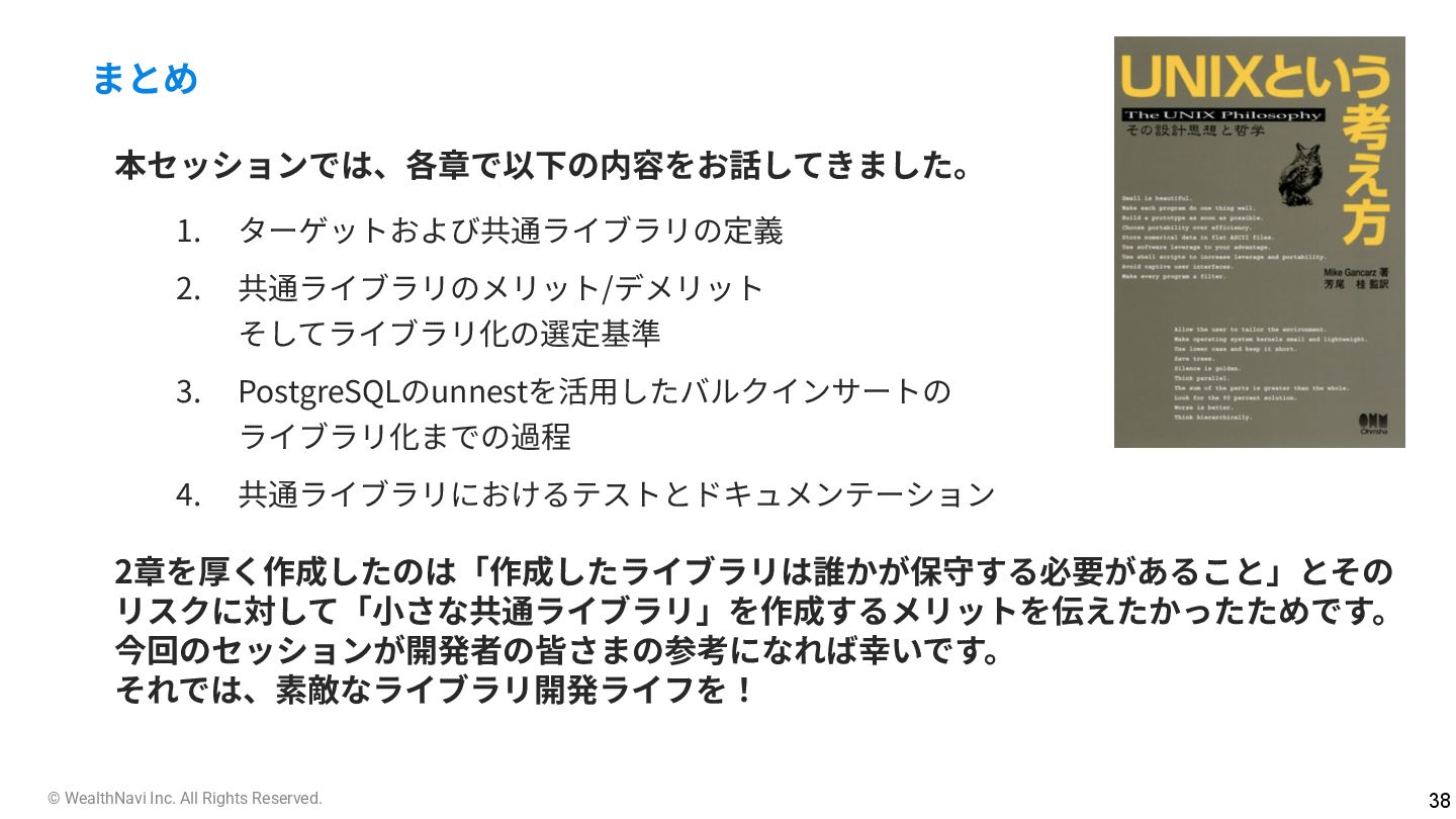 2. 共通ライブラリのメリット/デメリット そしてライブラリ化の選定基準 3. PostgreSQLのunnestを活⽤したバルクインサートの ライブラリ化までの過程 4. 共通ライブラリにおけるテストとドキュメンテーション 本セッションでは、各章で以下の内容をお話してきました。 2章を厚く作成したのは「作成したライブラリは誰かが保守する必要があること」とその リスクに対して「⼩さな共通ライブラリ」を作成するメリットを伝えたかったためです。 今回のセッションが開発者の皆さまの参考になれば幸いです。 それでは、素敵なライブラリ開発ライフを!